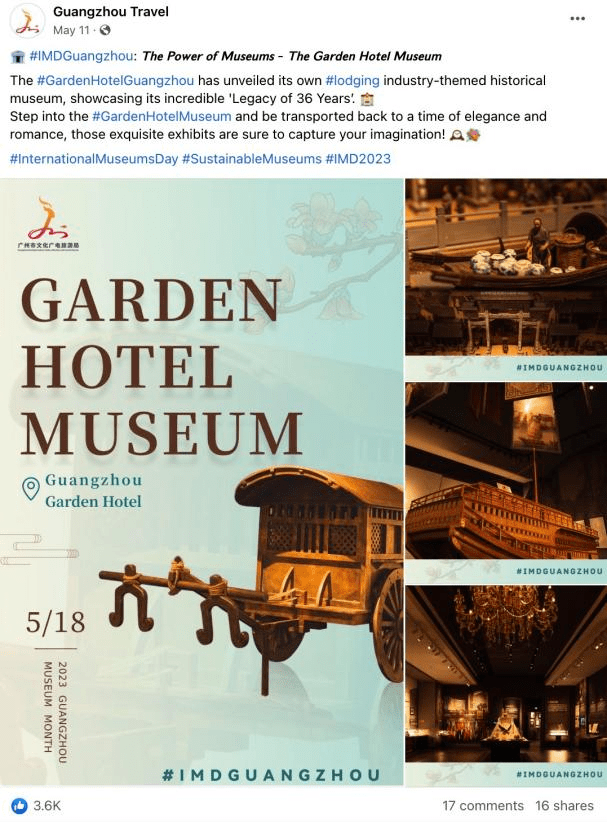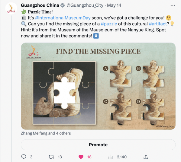 广州市文化广电旅游局海外社媒账号以“赏博物风雅,阅千年羊城”为5月主题,透过“寻宝博物馆”趣味拼图游戏及系列博物馆文物海报,与过去开启一场跨时空对话,与历史相遇,与艺术同行,呈现了广州历史文脉的隽永与璀璨。此系列共策划推出了9期贴文,系列贴文覆盖近24.8W人,参与互动近3.2W人次。