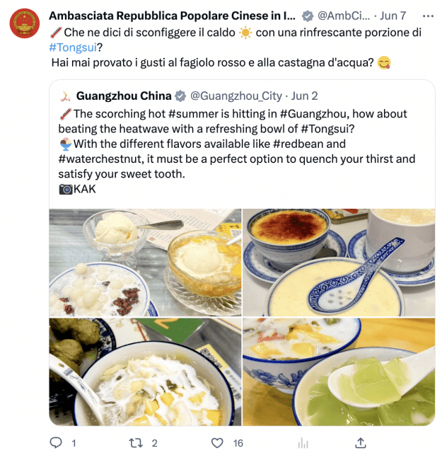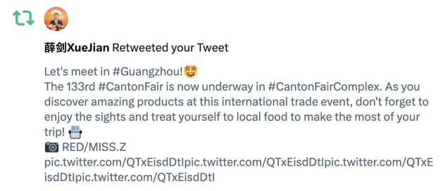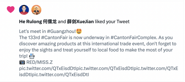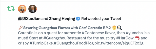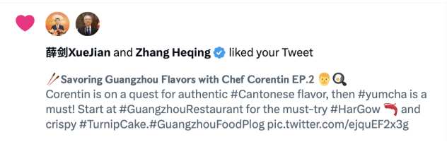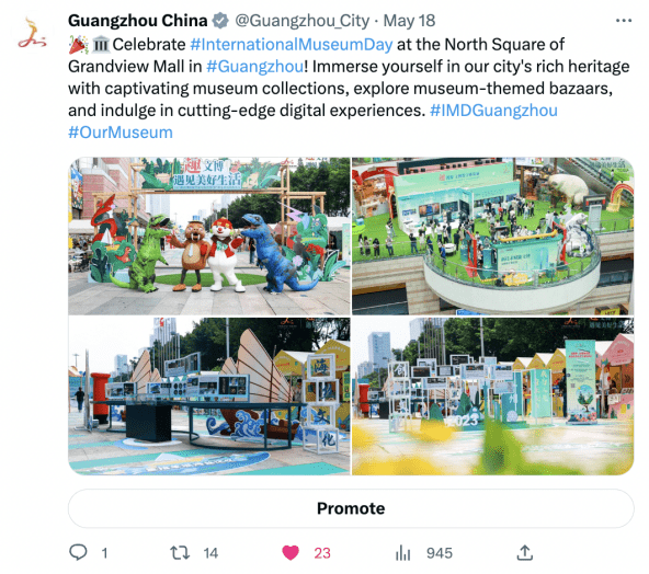 第二季度,广州市文化广电旅游局在海外平台推送的多条内容获得了众多位外交官的联动(转发、点赞、评论、提及&引用),如@zhang_heqing中国驻巴基斯坦大使馆文化参赞兼巴基斯坦中国文化中心主任张和清、@AmbCina中国驻意大利大使馆官号、@HeRulong 中华人民共和国驻冰岛大使何儒龙、@CGMeifangZhang 中国驻贝尔法斯特总领馆总领事张美芳 和@xuejianosaka 中华人民共和国驻大阪总领事薛剑等,并且保持与各省市海外社交媒体账号互动,运用官媒&大V的号召力,促进海内外联动,为全球粉丝带来更为深度的文旅体验。