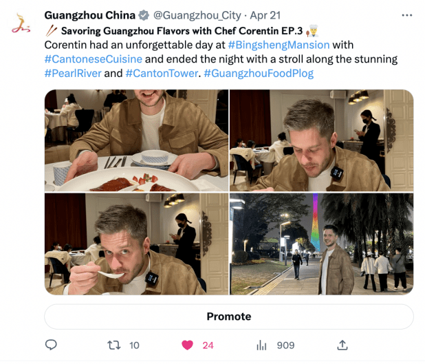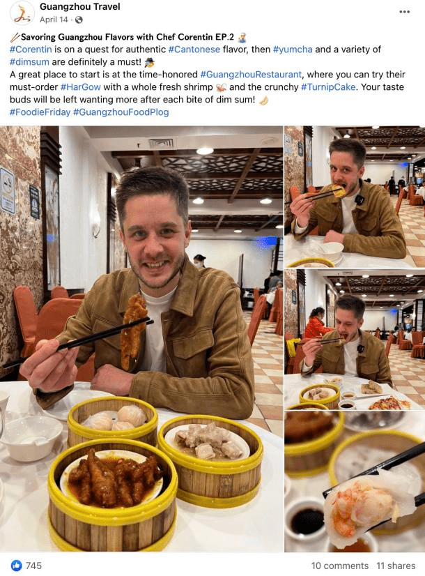 广州市文化广电旅游局海外社媒账号以“花城洋厨,广饮广食”为4月主题,法国主厨广坦化身美食荐客,共同追溯岭南美食文化精髓,感受粤菜海纳百川的魅力。此系列共策划推出了7期系列贴文,系列贴文覆盖近35.3W人,参与互动近1.2W人次。