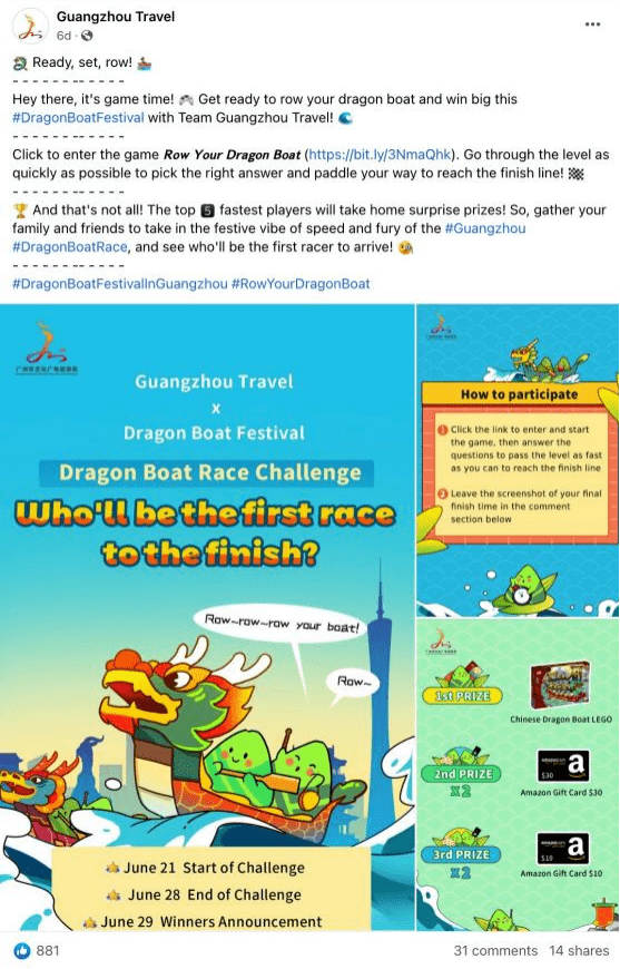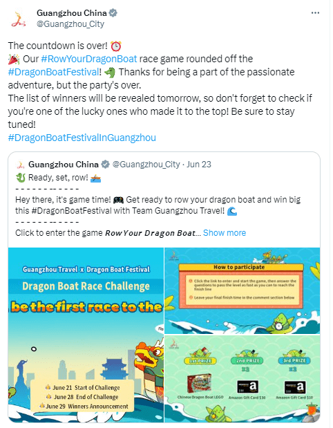 2023年端午节在@GuangzhouTravel平台发起#RowYourDragonBoat(广州线上龙舟竞渡挑战赛),结合广州端午传统文化习俗问答闯关挑战的游戏形式吸引全球网友积极参与挑战,寓学于乐,共同探寻中国传统文化的精髓,体验传统体育竞技精神的魅力。