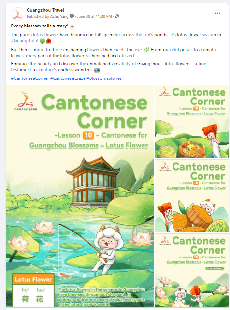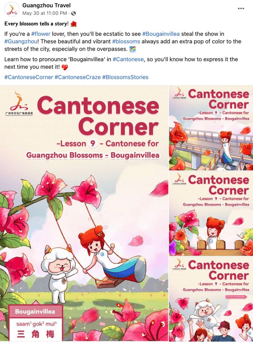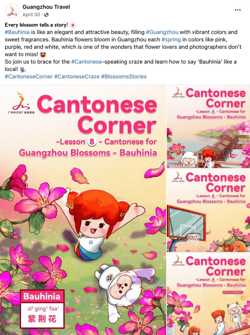 作为千年羊城,南国明珠,以粤语方言为主的广府文化发祥地,广州享有得天独厚的粤语文化底蕴。为向全世界推广这座拥有独特文化内涵的城市,在2023年第二季度,广州文旅海外社媒平台共策划推出了3期粤语角#CantoneseCorner栏目——“一花一故事“,以“花”为媒,以“花”为题,以粤语介绍广州标志性的花卉,在海内外掀起一股学粤语的热潮,讲好广州故事,感受广州文化底蕴,彰显广州“花城”的美誉,擦亮广州“花城”名片,让更多海内外网友了解和关注粤语文化。
