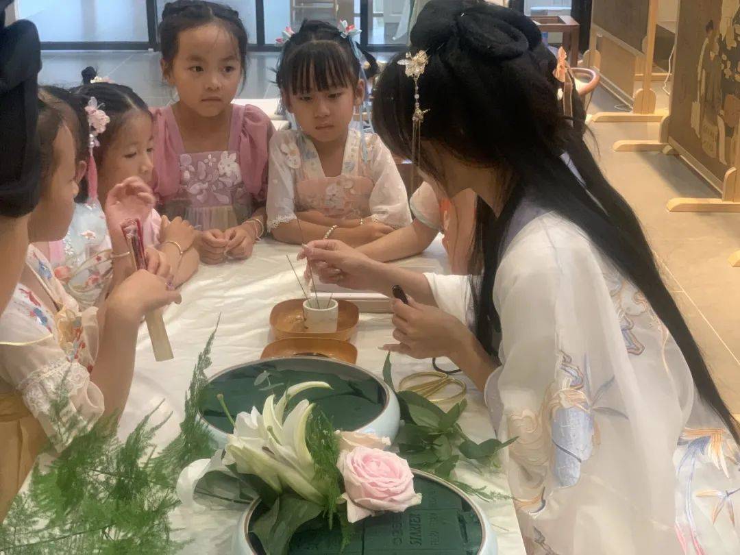 接着体验了宋韵四般闲事里的焚香、插花,听琴音袅袅,和爸爸妈妈一起手作团扇和茧子画DIY,既深入了解了宋代文物知识,又动手动脑体验了古宋人的艺术文化生活的智慧。
