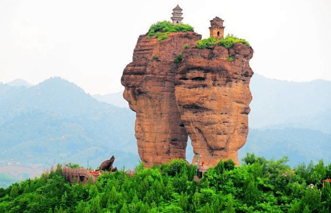 双塔山距今已经有1300年的历史了,这里有两座寺庙,每一座寺庙都位于一座悬崖峭壁上去,景色甚是壮观。这两座古庙只能远远地看,因为没有登上悬崖峭壁的楼梯,所以也就没办法进到古庙里边,据说古庙里其实什么都没有,只有几本古书跟几双草鞋而已。