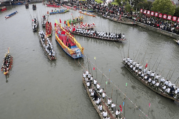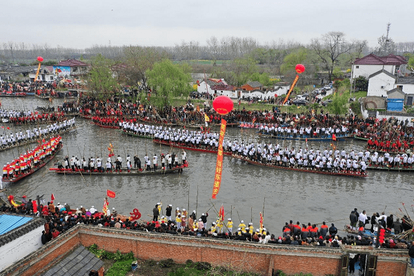 4月5日上午,江苏省兴化市戴南镇近300条会船、龙舟云集在茅山村、刁良村、管家村等五个村宽阔的水面上进行划会船、赛龙舟活动,场面十分壮观。参赛选手约5000人,前来观看游客两万人左右。一位扬州游客赋诗一首,赞美会船盛况:“野外气清风景显,长空尽碧物皆明。戴南船会云舟竞,万桨千篙击水轻。”