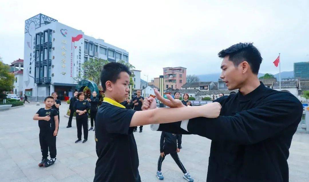 王母围古村前,一群青少年正在教练的带领下练习咏春拳。