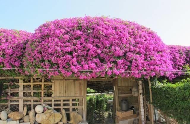路过一处人家,庭院种满了各种各样的花,未走进就可以看到大门口修剪得像一把大雨伞的三角梅,远远望去像是是盛开的紫红云霞。