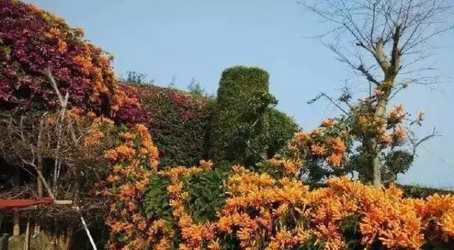 庭院里和门口都是花木,花团锦簇的三角梅,爬满墙的炮仗花,火灯笼花……每一株都被养护的很漂亮。
