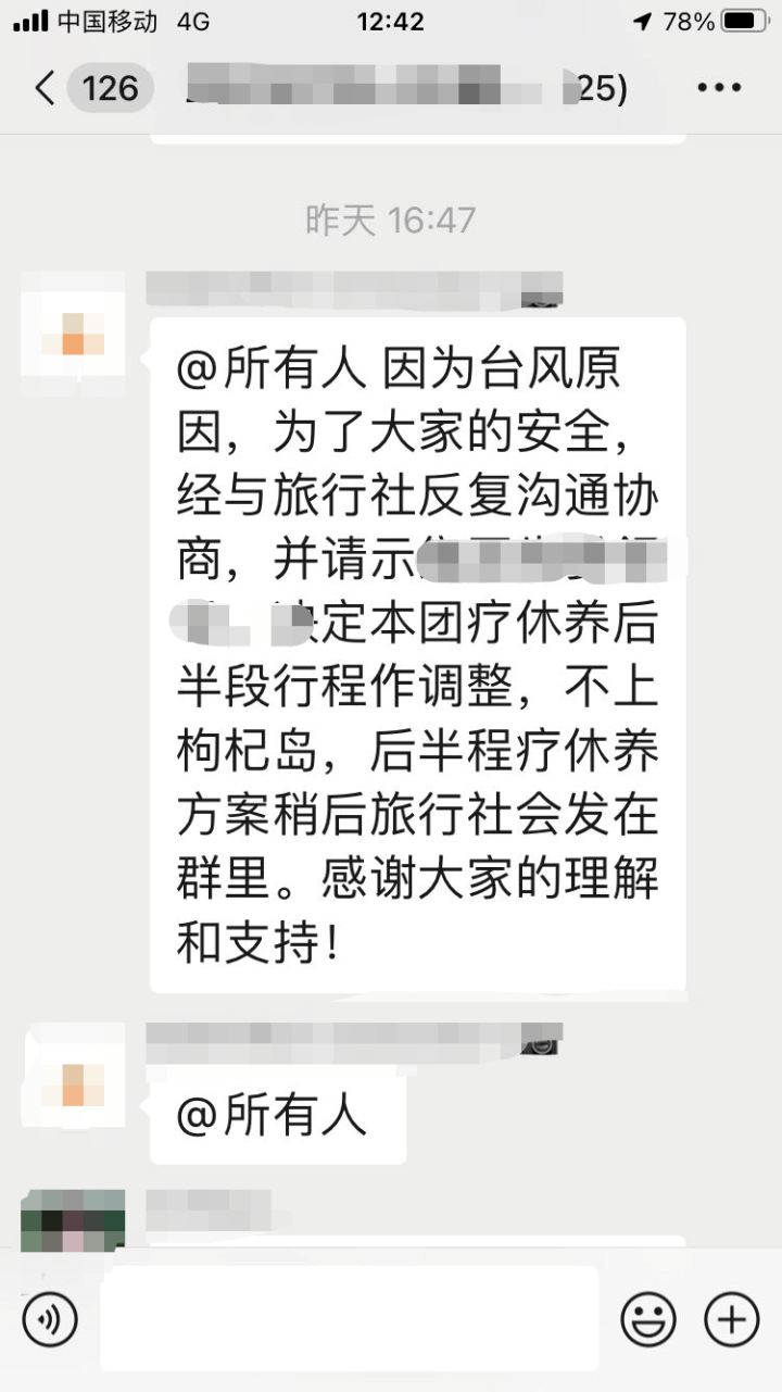 “@所有人 因为台风原因,为了大家的安全经与旅行社反复沟通协商,决定本团后半段行程作调整,不上枸杞岛,后半程方案稍后旅行社会发在群里。感谢大家的理解和支持!”