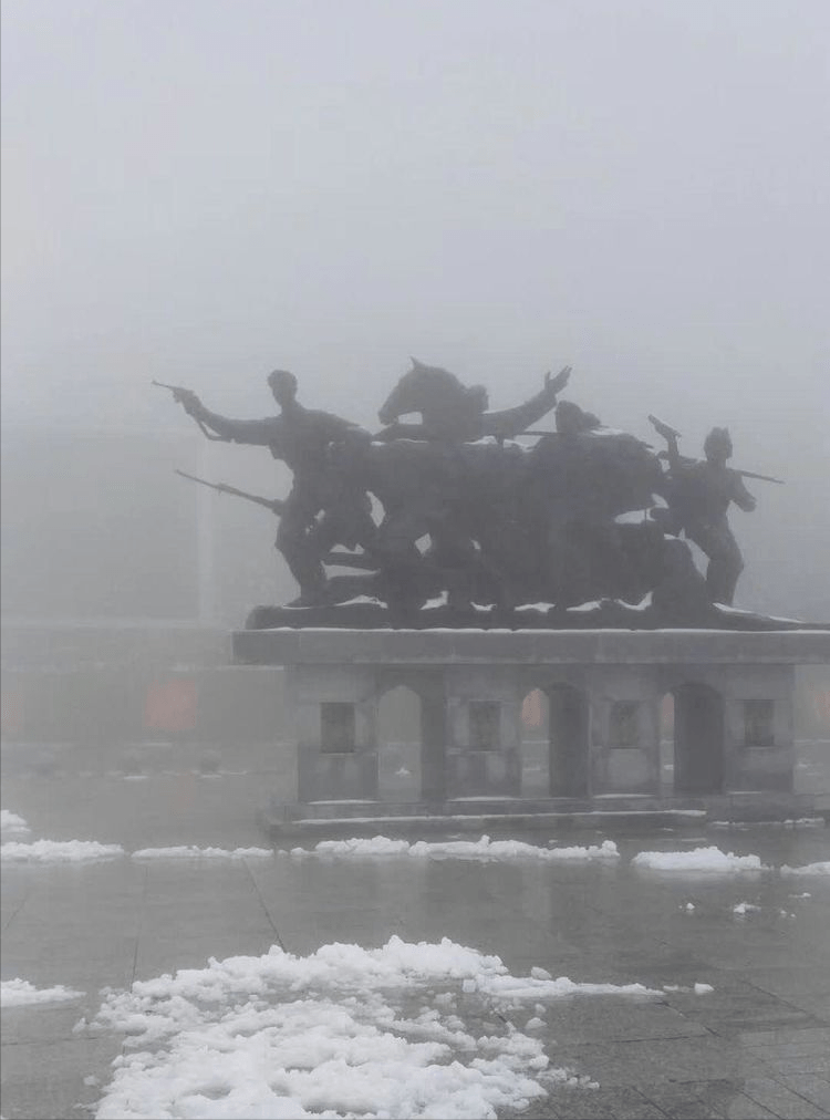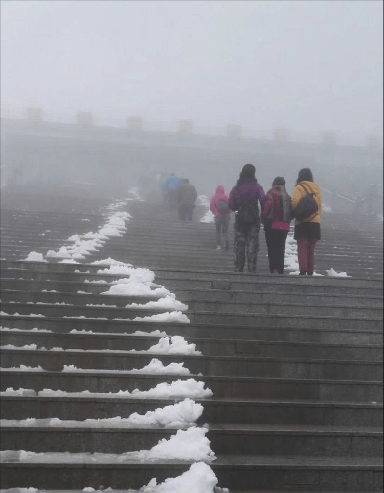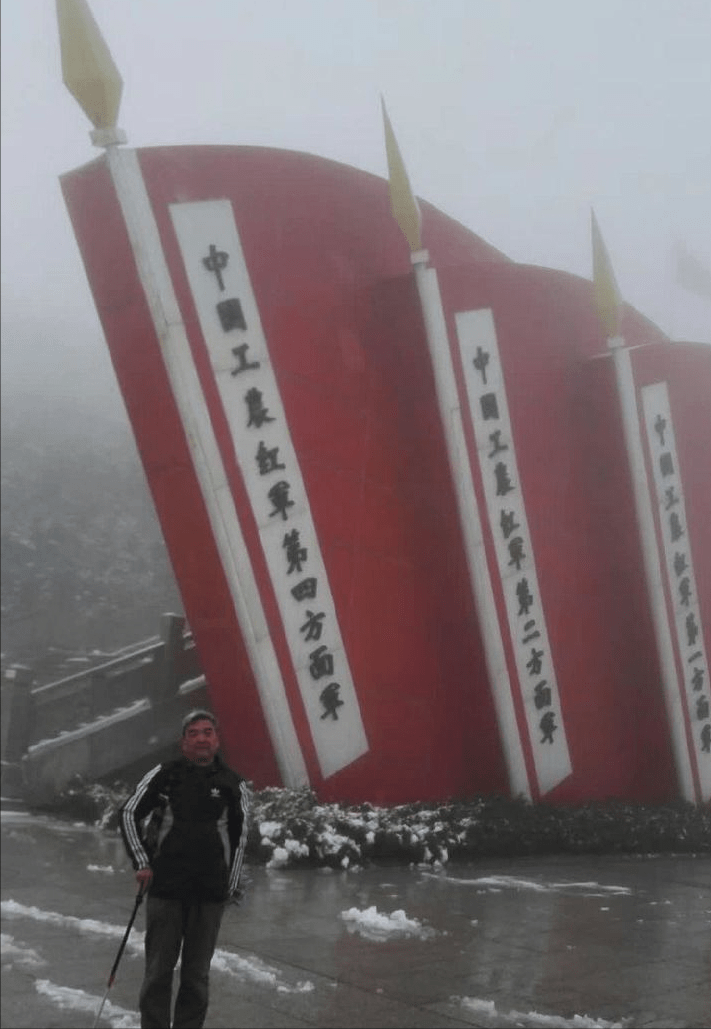 车到半山后,就发现了路上的积雪,越上越大。到达山顶一下车,一股寒气逼来,不禁打了一个哆嗦。地上,树上,房上都是白茫茫的一片,宽阔的广场上,积雪已开始融化,到处都是水。两边的浮雕、象征着红军三大主力的那三面巨大的红旗,都淹没在浓雾之中。