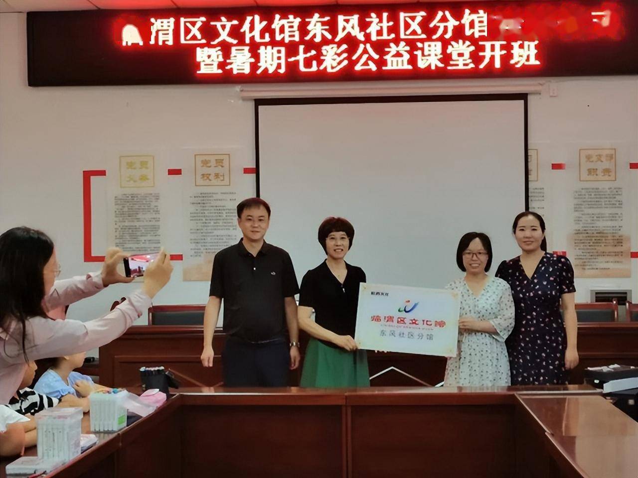 【挂牌仪式举行】7月25日,临渭区文化馆东风社区分馆挂牌仪式暨暑期七彩公益课堂开班仪式在人民办东风社区举行。临渭区文化馆总分馆制建设是陕西省首批试点建设单位之一,至2020年实现了全区街镇分馆建设的全覆盖,由区文化馆创建的行业性分馆建设试点经验在全省进行推广。