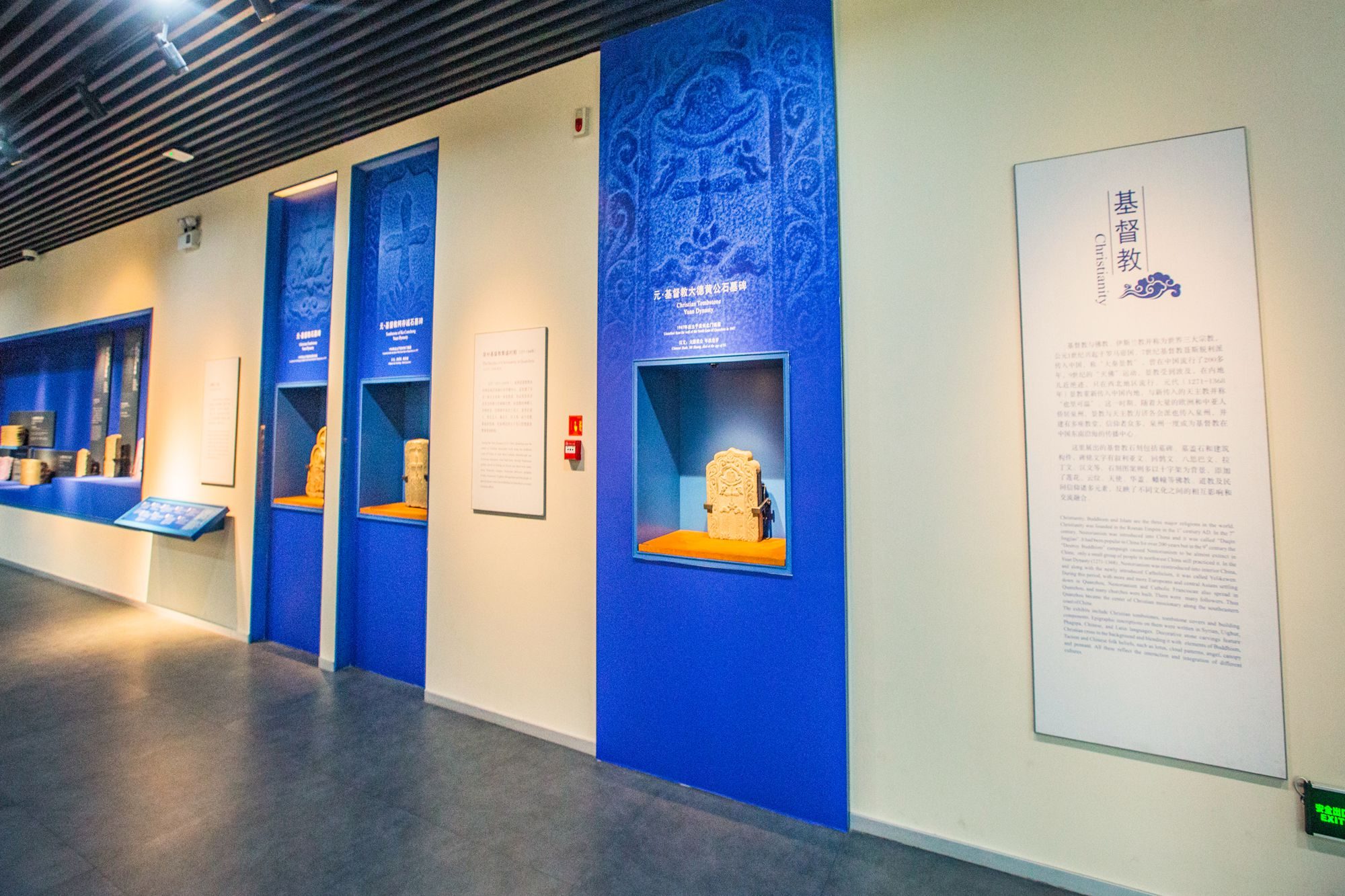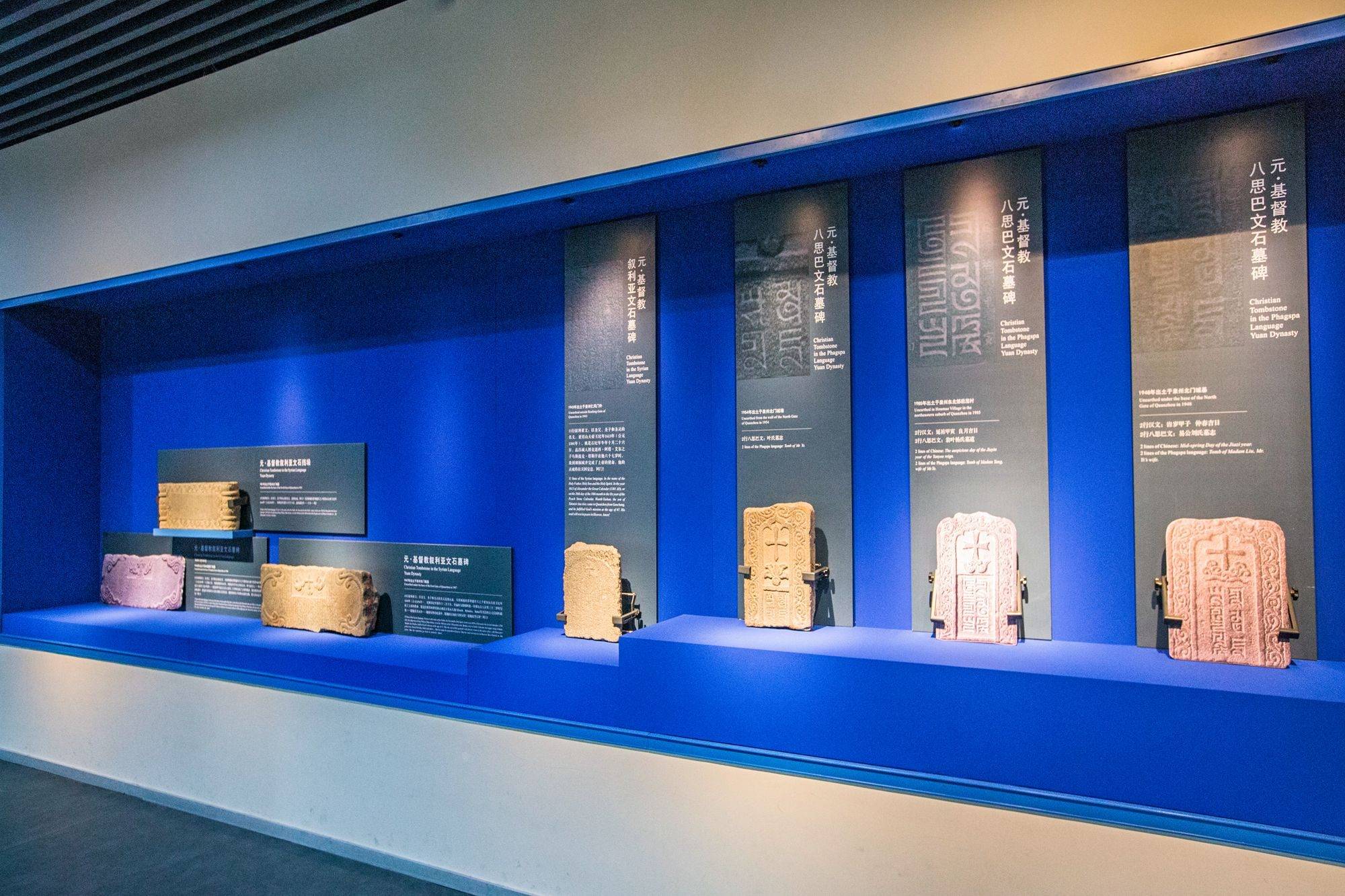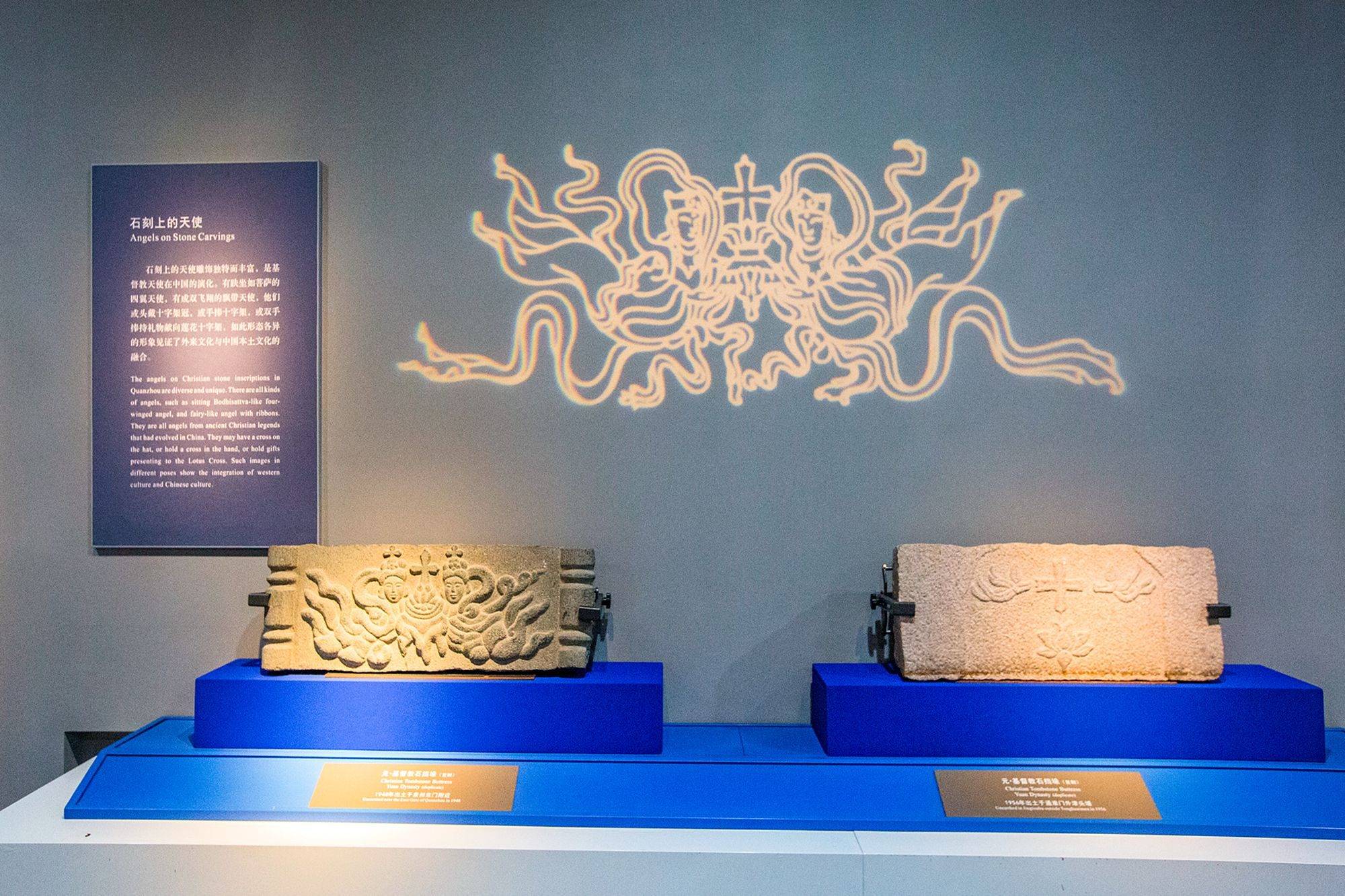 陈列馆主要分为基督教和印度教石刻展区两部分,前者以蓝色为主色调,深邃的蓝很容易让人们联想到海洋,乘船来往泉州的外国人中有不少基督教徒,虽然具体时间已无从考证,但基督教正是随着他们从大洋彼岸进入了泉州的。