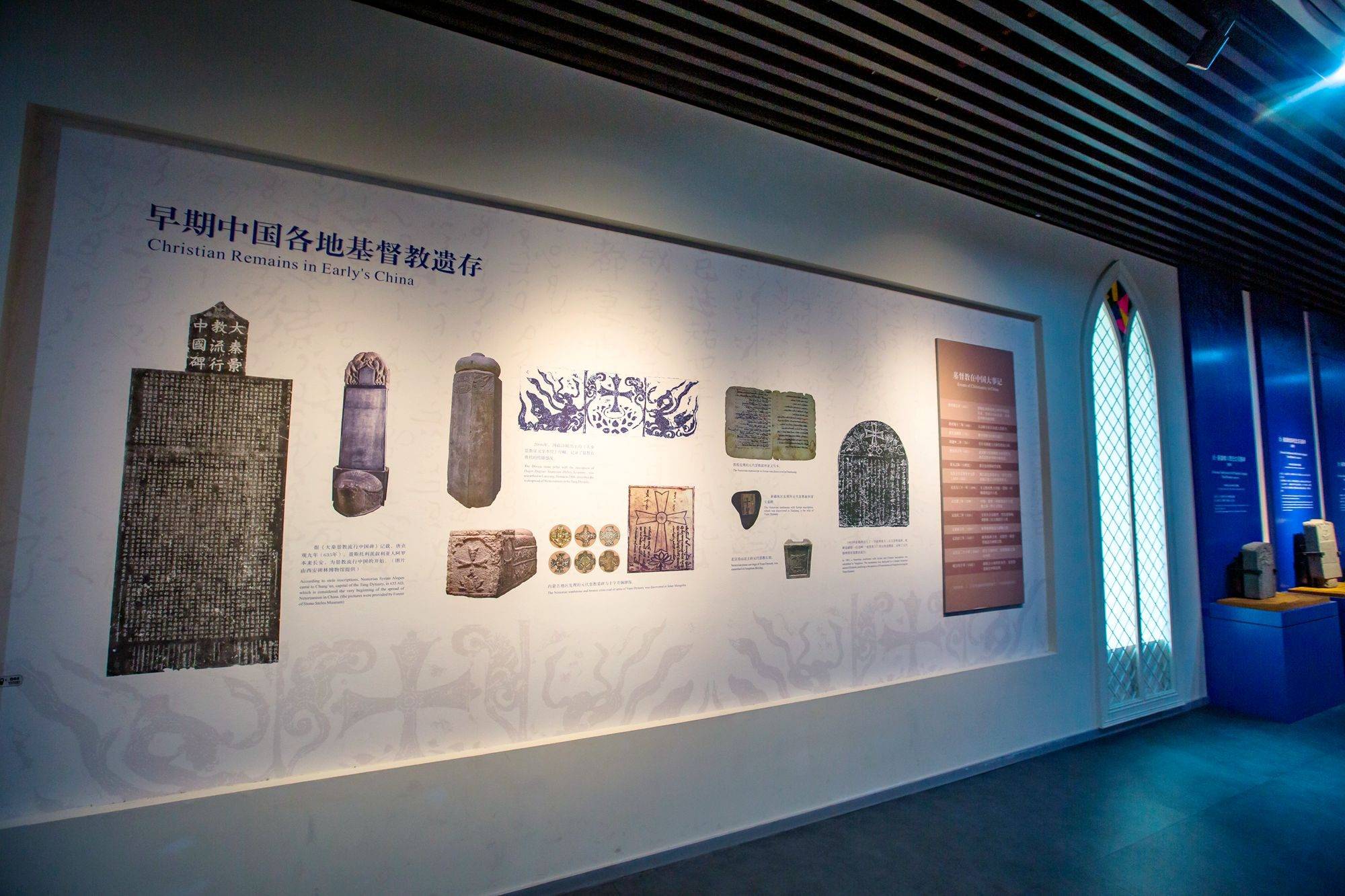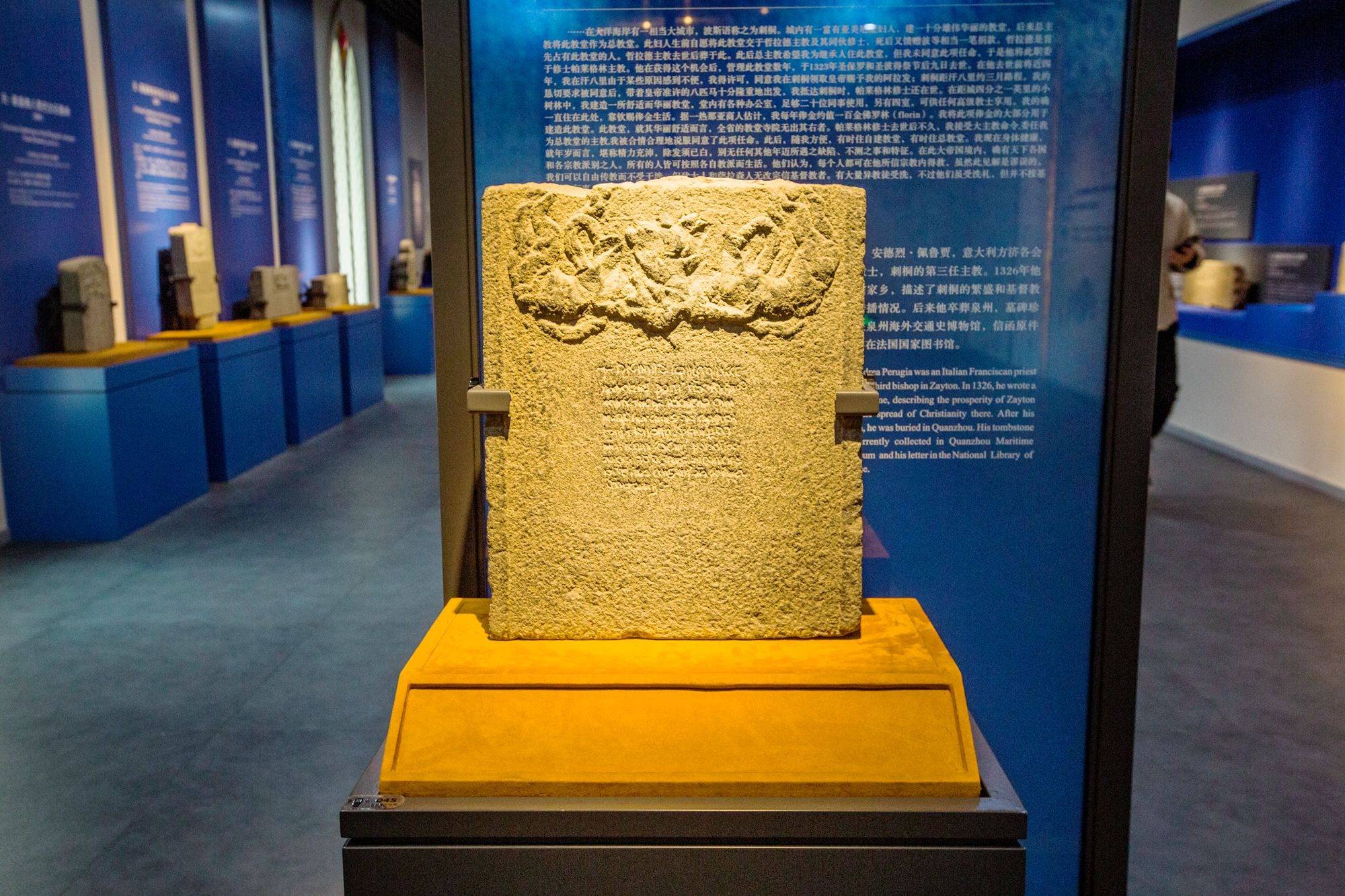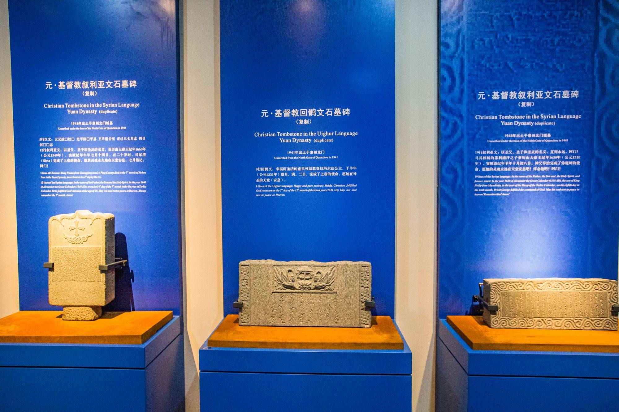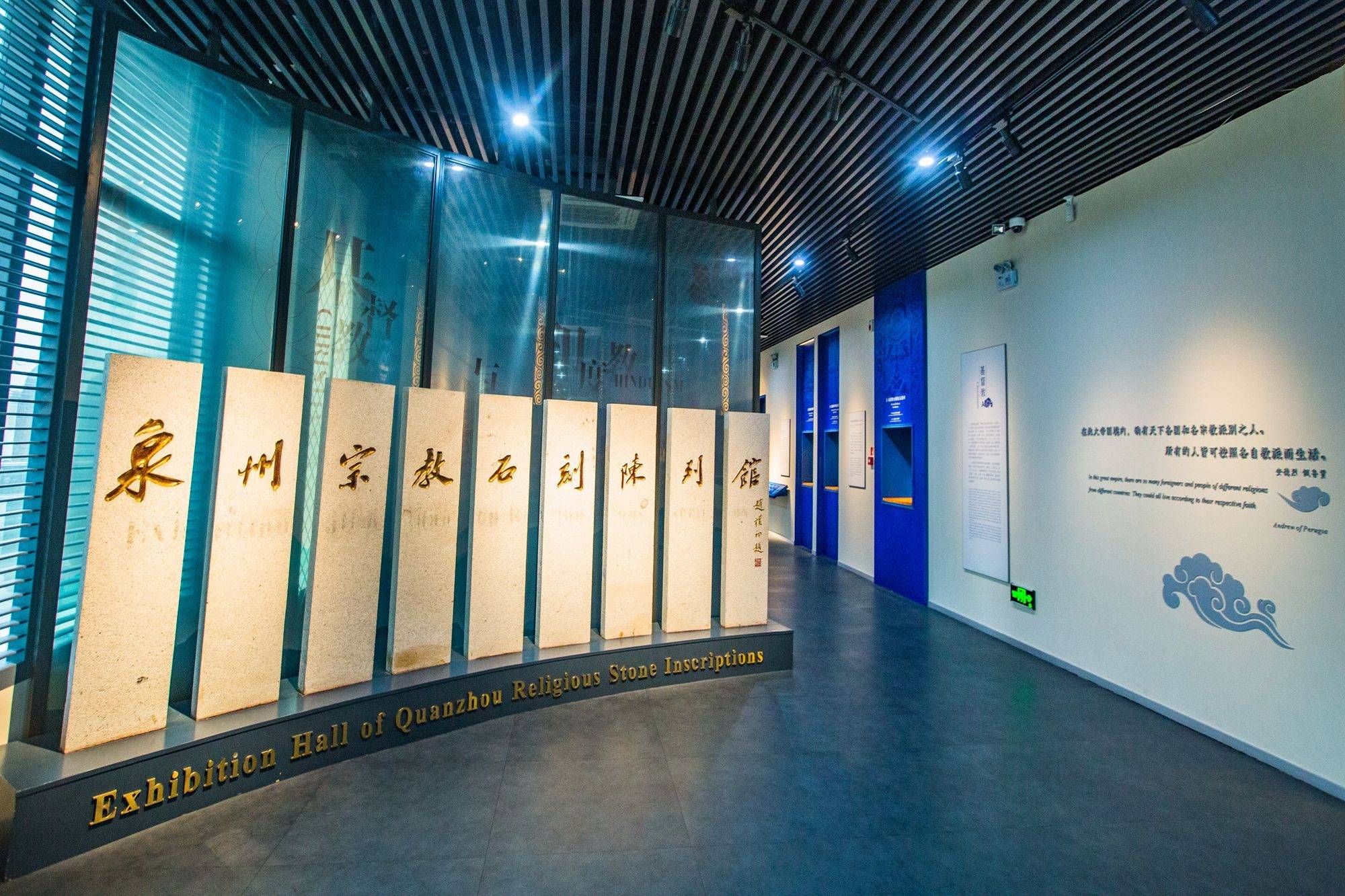 陈列馆主要分为基督教和印度教石刻展区两部分,前者以蓝色为主色调,深邃的蓝很容易让人们联想到海洋,乘船来往泉州的外国人中有不少基督教徒,虽然具体时间已无从考证,但基督教正是随着他们从大洋彼岸进入了泉州的。