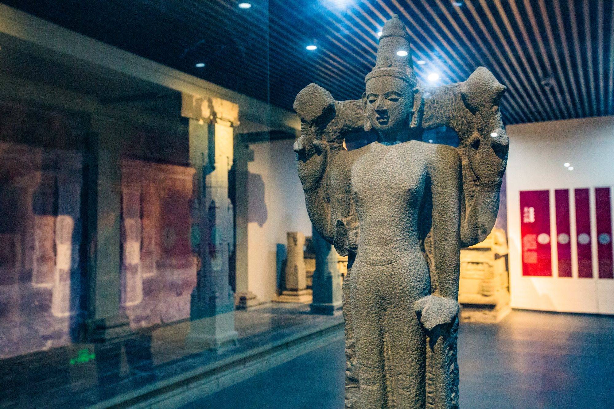 离开蓝色基督教石刻展区,走入热烈的红色之中,便到了印度教石刻展区。泉州是中国唯一留下印度教寺遗存的城市,目前陈列馆中展示的印度教石刻都是已经消失的泉州印度教寺和祭坛上的建筑构件,非常珍贵。