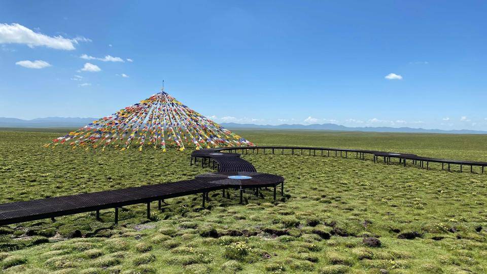 在藏区自驾行,公路上空悬挂经幡是常见的形态。但美仁大草原以经幡群那叹为观止的长度、密度,完美诠释了“隧道”二字。