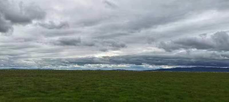 地势平坦而辽阔,在远方有微微起伏,整个大地都被绿油油的草覆盖着,像铺了一层厚厚的地毯,在蓝天的映衬下,显得格外清新。