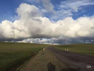 蒙古没有高速公路,好一点的柏油马路也只是相当于国内的县道,虽小但光整。在蒙古自驾,感受到的是自然、壮美、神奇、舒爽。面前的路时而犹如一条蛟龙,盘踞于群山峻岭,蜿蜒曲折、跌宕起伏,开车盘旋在这山洼之间,一会儿山深林密,浓荫蔽天,没多久过了一个坡又见天朗气清,蜂飞蝶闹,于是路平坡缓,草香花艳,放眼望去,远处的天边就是尽头,蓝天与之相接,白云与之呼应。