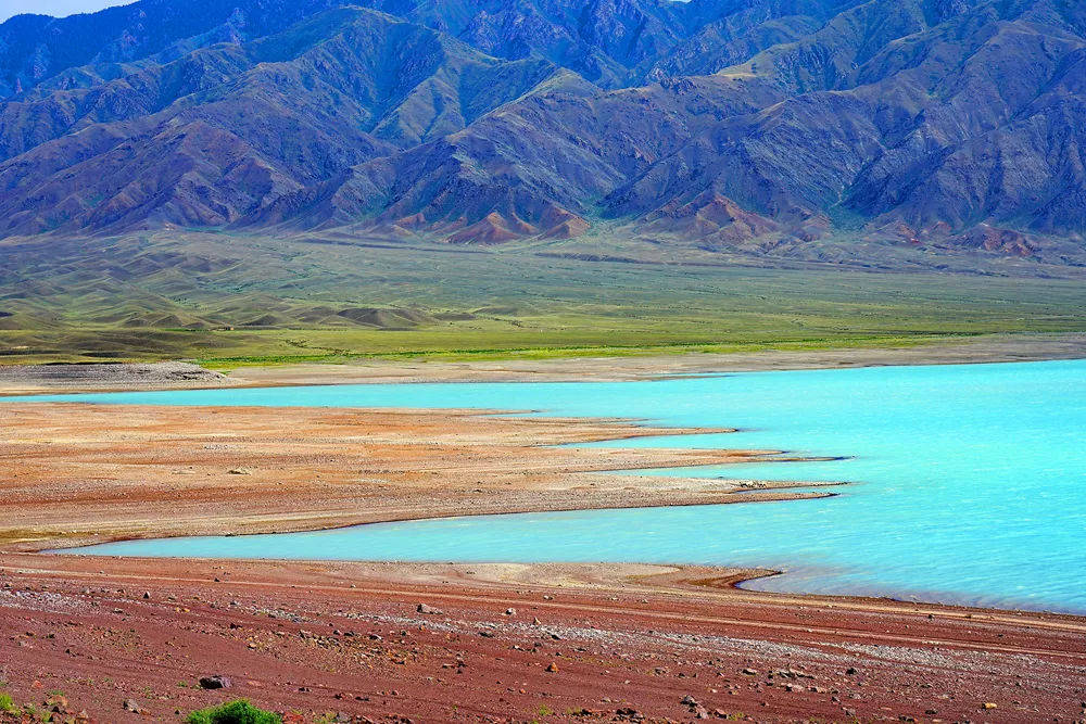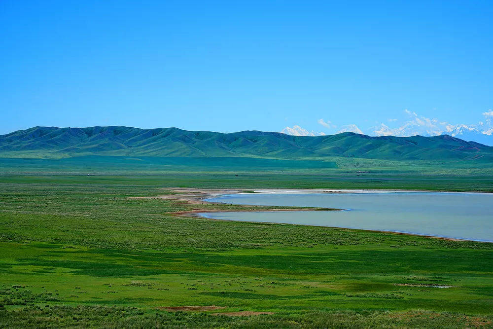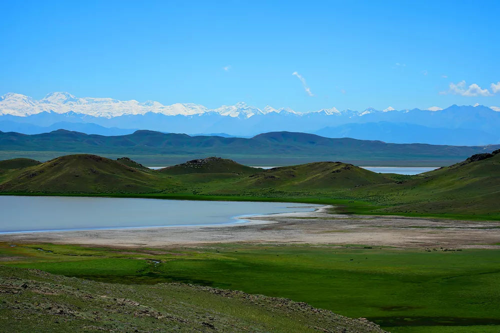 Tuzkol湖全长5公里,有些地方宽度可达到1公里。湖面面积3.2平方公里,水深3米,在组成上与死海相似,但盐度的程度随季节而变化。这个并不算辽阔的湖面被荒芜的草原包围,如同镶嵌在大地上的一颗明亮的眼睛。那宝石般透彻的水面,映衬出了天空的湛蓝。远处雪山耸立,近处绵延不断的绿色丘陵王国,相互依偎,遗世而独立。