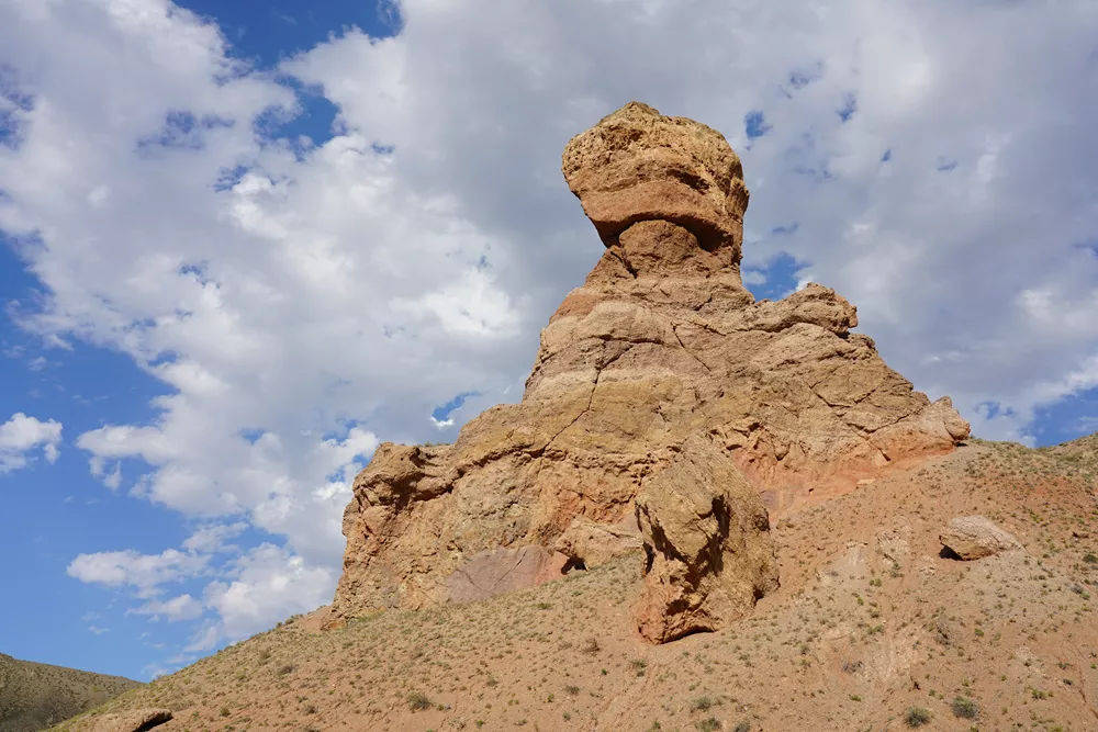Bayankol峡谷距离阿拉木图市区大约380公里。一路在哈萨克斯坦野外平坦的公路上飞驰。远处巍峨的雪山一路相伴。它们沐浴着明媚的阳光,通体灿烁如银剑指天。那白色冠顶的山峰,似流银的白岩,在下方秀木葱郁的衬托下格外皎洁,让人心如明镜,神清气爽。