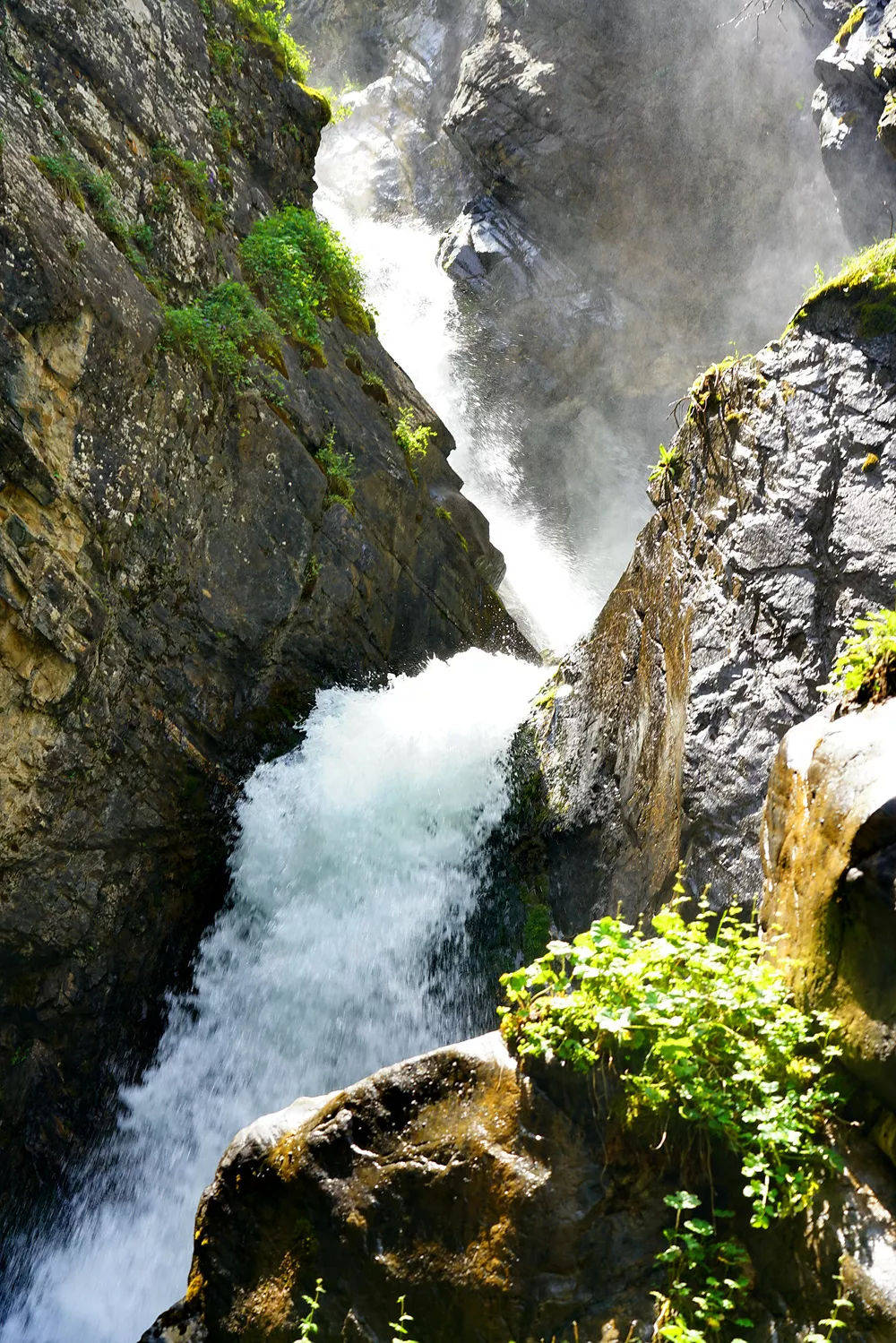 瀑布落下,溅起无数细珠碎玉,落在岩石形成万朵水花和水雾,飞溅的水露,在山前飘扬,白蒙蒙一片,长年累月飘忽不散,有阳光之日,五彩缤纷,光彩夺目,使人如入浑沌迷蒙仙境。