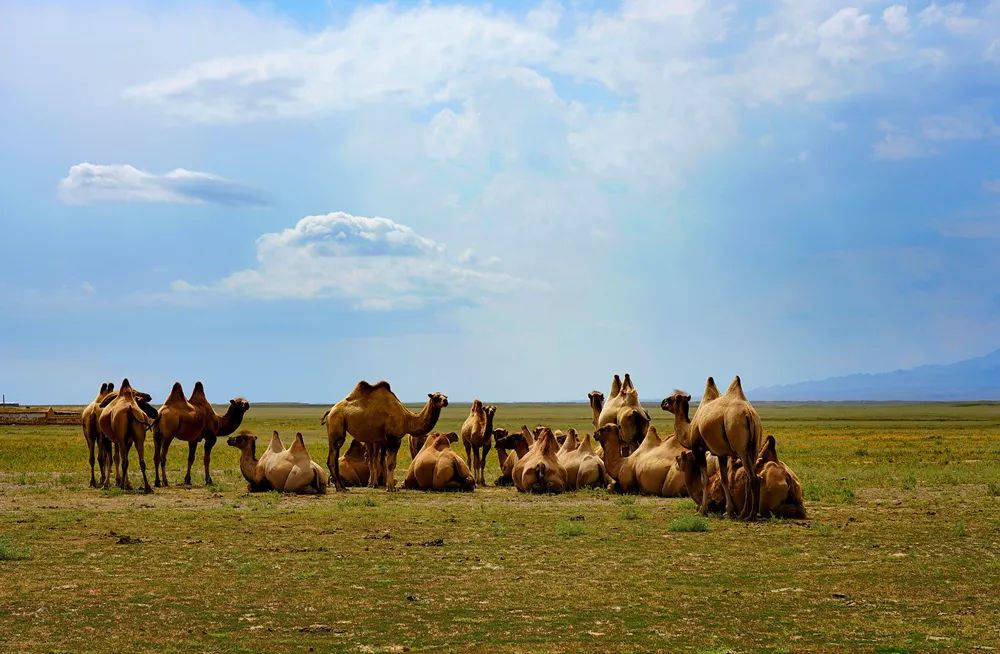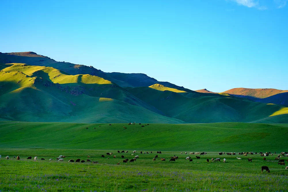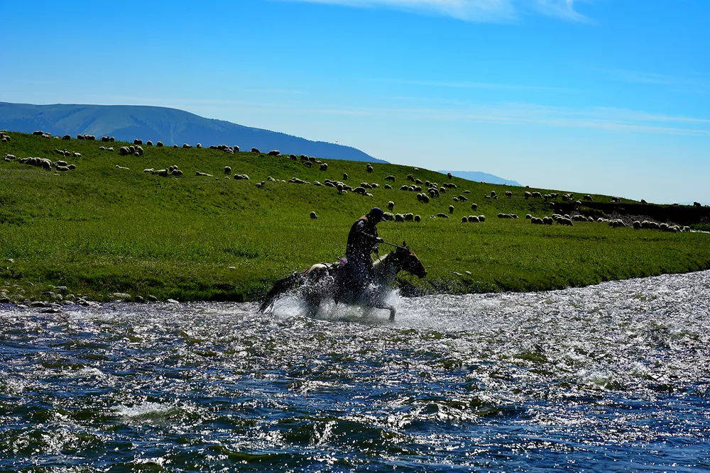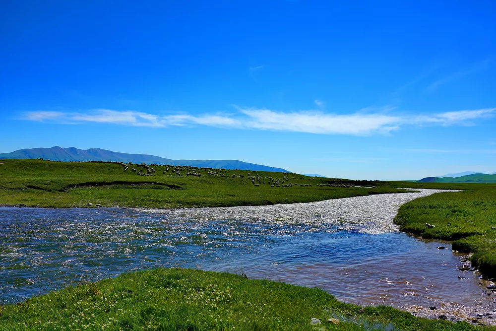 蜿蜒的河流穿过一望无际的草原,把大地的绿色地毯一分为二。不远处,羊群们吃过这里肥沃的食物,那健壮的身姿映衬在蓝天、雪山和绿草之间,点缀着一幅自然的山水画卷。在太阳下,那点点水泡似的蒙古包,闪烁着白光。