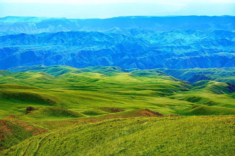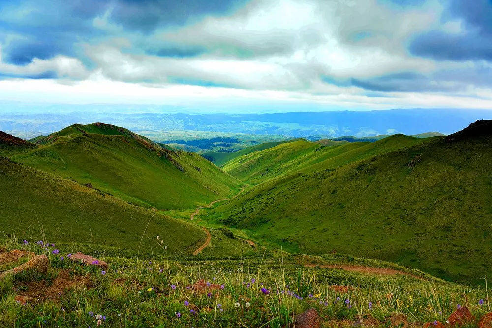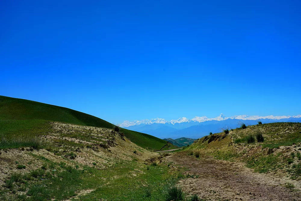 Ketmen呈高山深谷地貌,绵延的山丘此起彼伏,就像大地之上绿色的波浪线,弯弯曲曲。