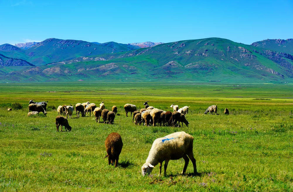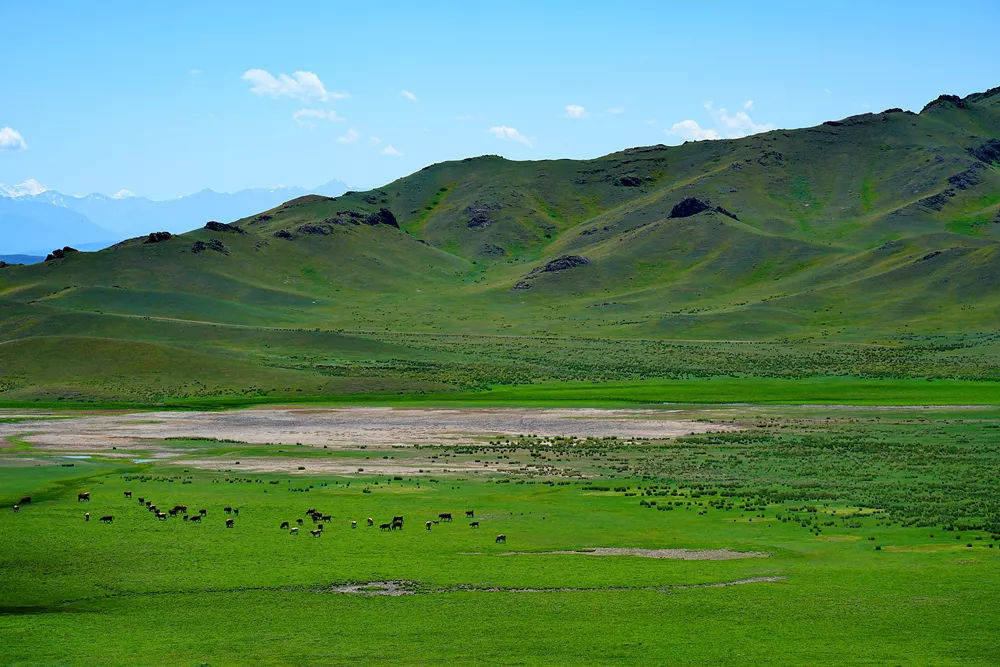 Assy高原海拔2800-3000米,在这里,雪山和草原紧密相连,白色的羊群在犹如绿色地毯的草地上慢慢蠕动,白色的蒙古包点缀其中,一切生命都似乎融入了这一片神圣而辽阔的土地。科学家们还在这里发现了5000年前古代人类的遗体,然而5000年过去,这里仍然保存着原始世界的自然和纯粹。