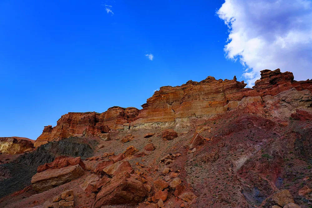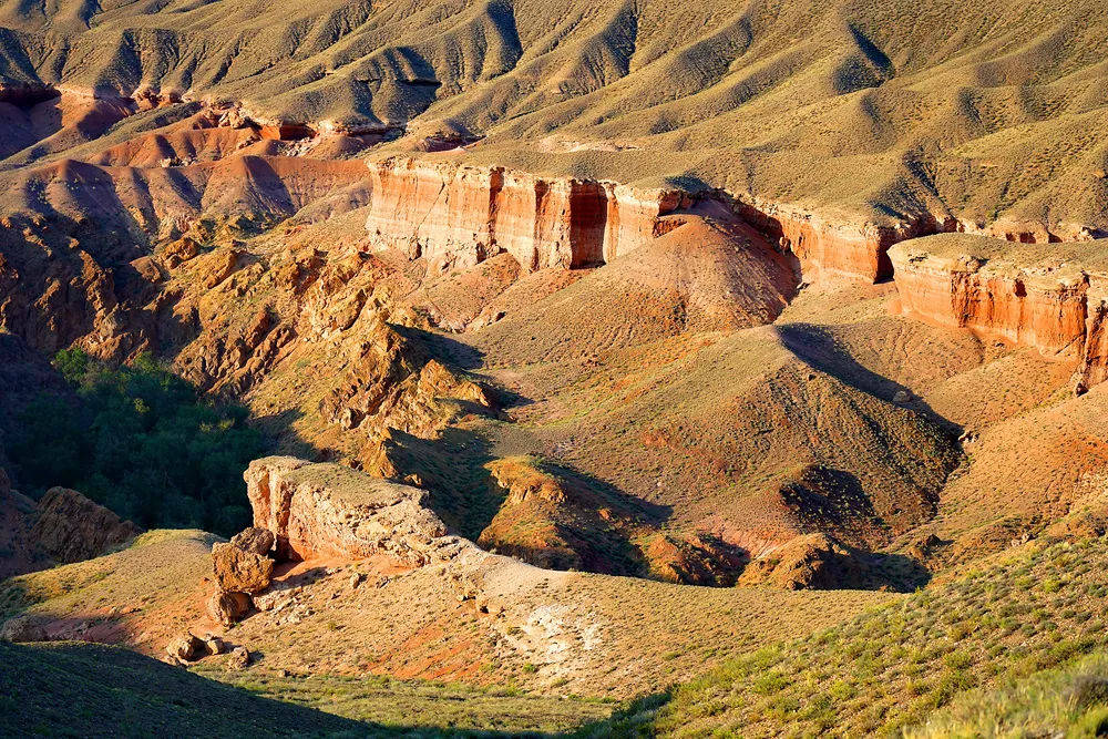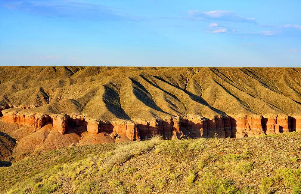 近处,映入眼帘的是一处由风和水联合创造的大自然的奇迹——这里是Temirlik峡谷。Temirlik峡谷像是上苍在草原腹地上撕开的一道狭长的裂缝,峡谷两旁是红色岩石形成的峭壁,留下风霜雨雪长年累月的侵蚀的痕迹。