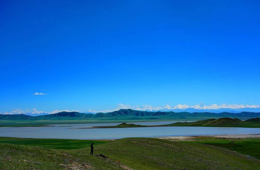 夏天热情的阳光播撒在这片土地上,映衬着蓝色的湖水、橙色的沙滩、碧绿的草地,以及远方那薄雾环绕的雪山。