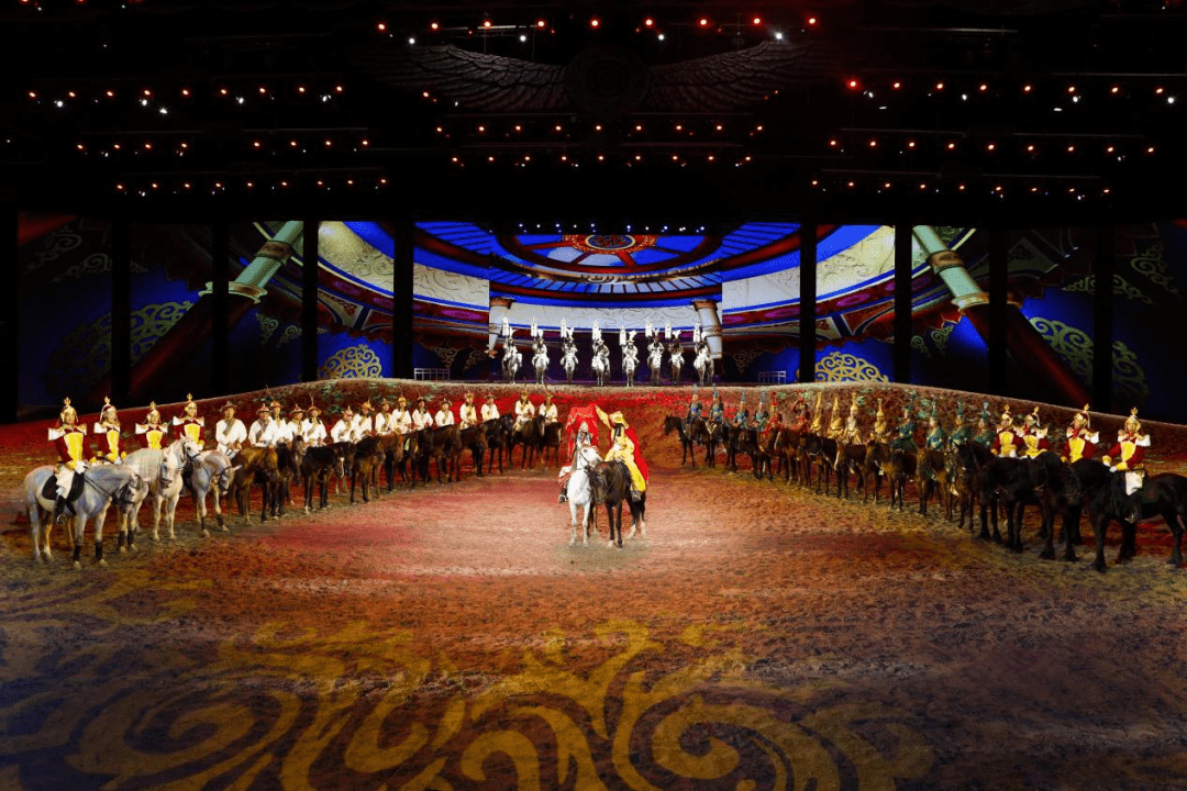 19:20从大青山野生动物园出发,20:00到达内蒙古少数民族群众文化体育运动中心,观看大型实景马舞剧《千古马颂》