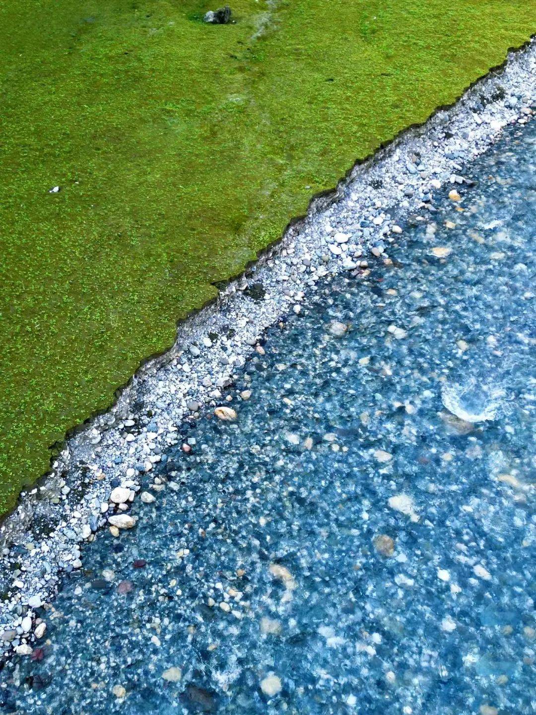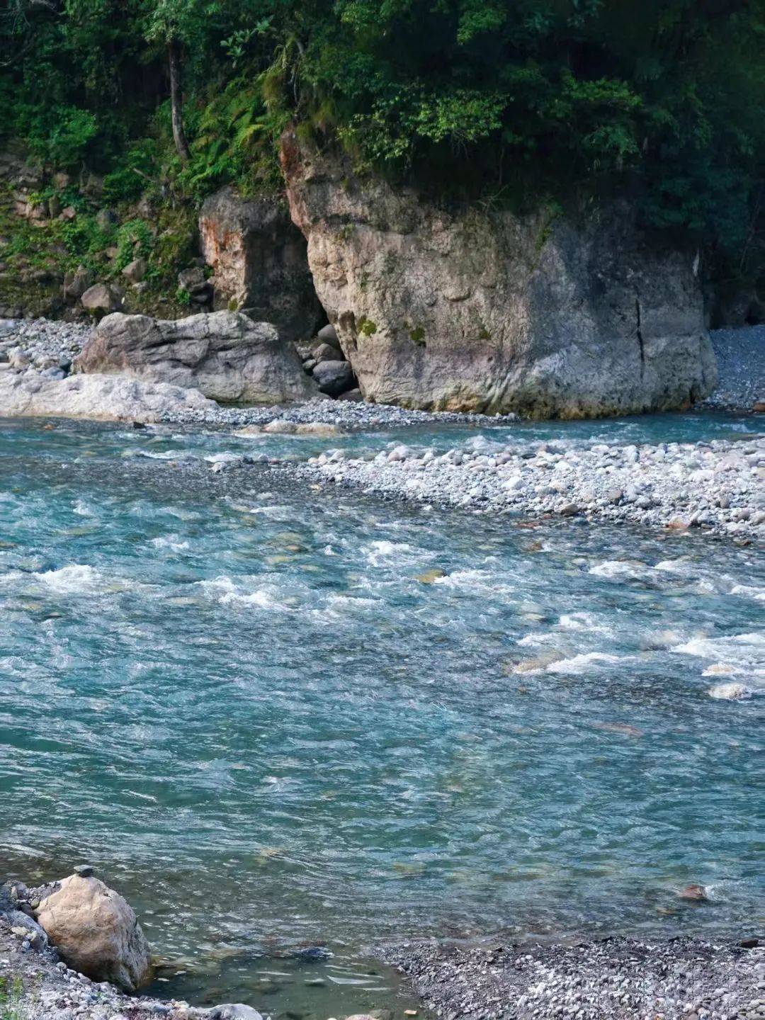 这地方的水是冰雪融水,所以比较凉,如果一段时间都没有下雨那么,这里的水可以清澈见底,河边还有个面积挺大的草坪,在这里搭个天幕和帐篷,就可以轻松享受清凉的山野了。