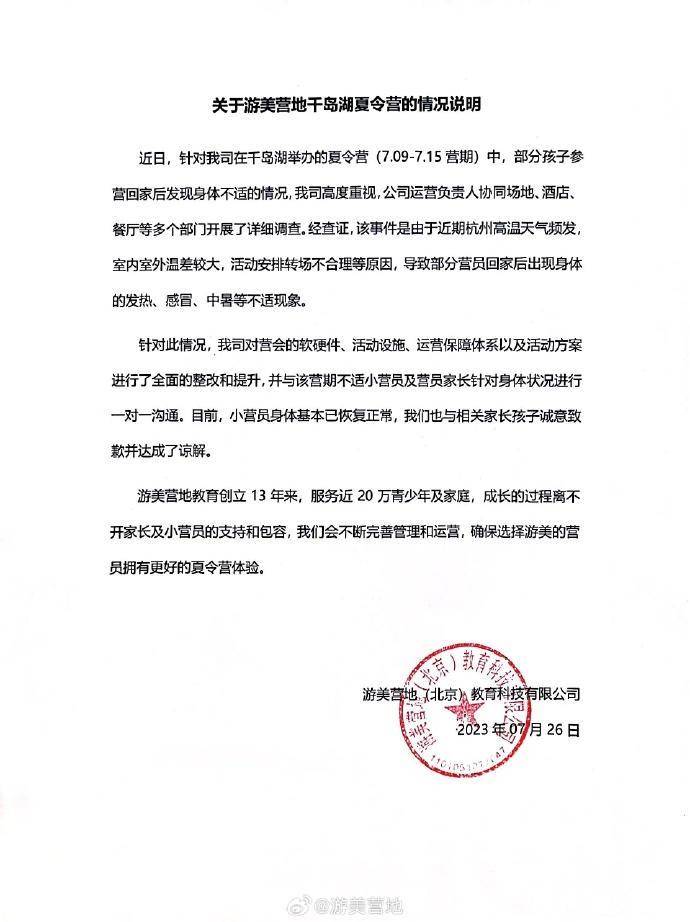 7月26日,游美营地发布《关于游美营地千岛湖夏令营的情况说明》,称经查证,是由高温天气频发,室内室外温差较大,活动安排转场不合理等原因造成。