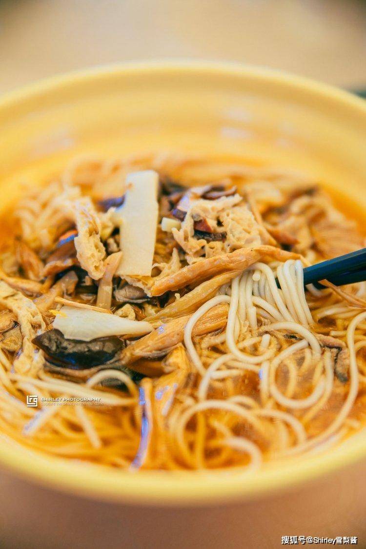 每人一份罗汉素面,端上桌后飘来淡淡的素食香味。清澈柔和的素高汤,以及富有嚼劲的苏式面条,堪称是绝配。