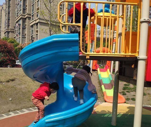 从上面滑的孩子看不到这对逆向往上爬的姐弟,有时候滑下来还会无意把弟弟给踢倒。滑梯是没有扶手的,加上梯面非常滑,不好爬上去,随时都有可能摔下去,看起来十分危险。