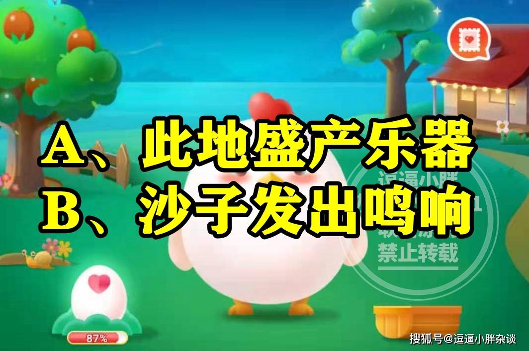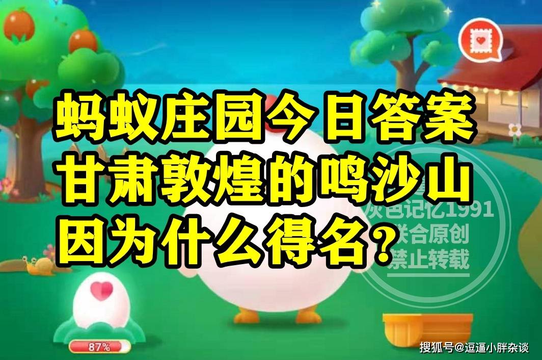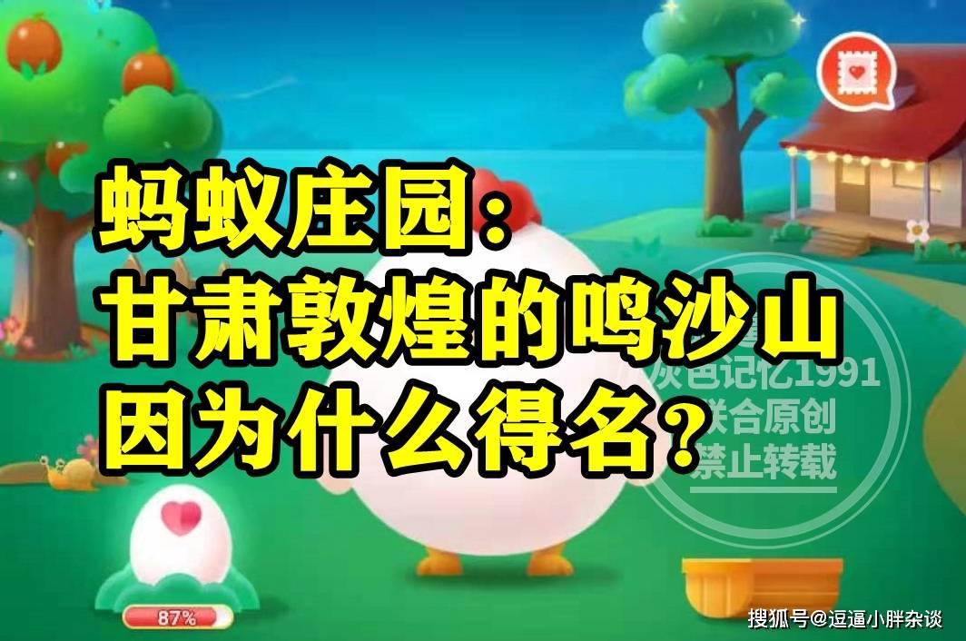 还不清楚,甘肃敦煌的鸣沙山因为什么得名?答案的同学,选项中有两个选择,分别是:此地生产乐器或者沙子发出鸣响。还不清楚,甘肃敦煌鸣沙山是因为啥而得名?答案的同学,下面就一起来看看,蚂蚁庄园题目:鸣沙山是因为啥原因得名的呢?的答案解析吧。