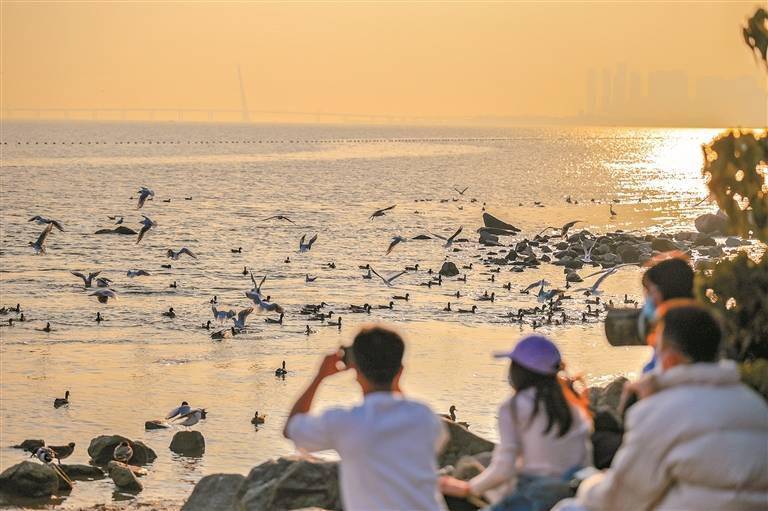 ▲市民在深圳湾漫步时见证万鸟齐飞的景象。 受访者供图