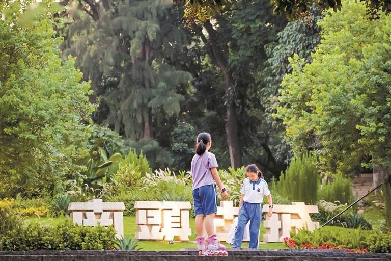 ▲落日时分,深晚记者在南头古城漫步时,两名学生正在游玩。 深圳晚报记者 吴洁 实习生 谭佳 摄
