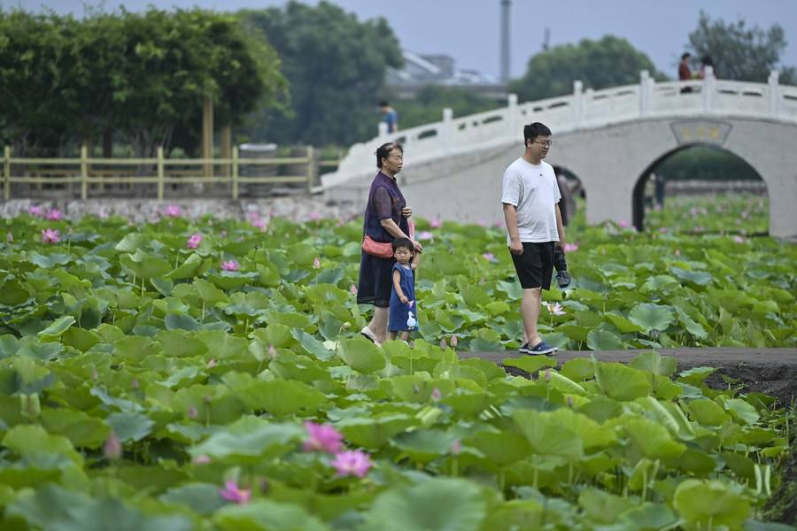 7月29日,游客在山西省太原市晋源区北大寺村观赏荷花。新华社记者 杨晨光 摄