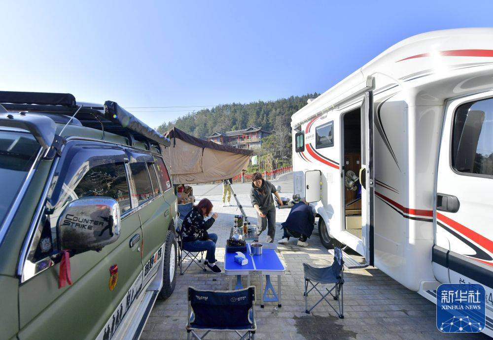 ↑4月1日,在宣恩县椒园镇黄坪村,开着房车旅行的游客在梨园旁的空地上准备早餐。新华社发(宋文 摄)