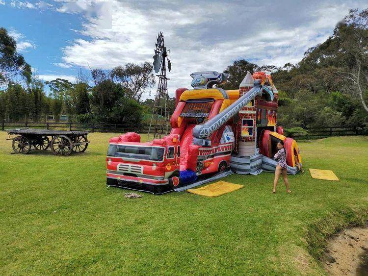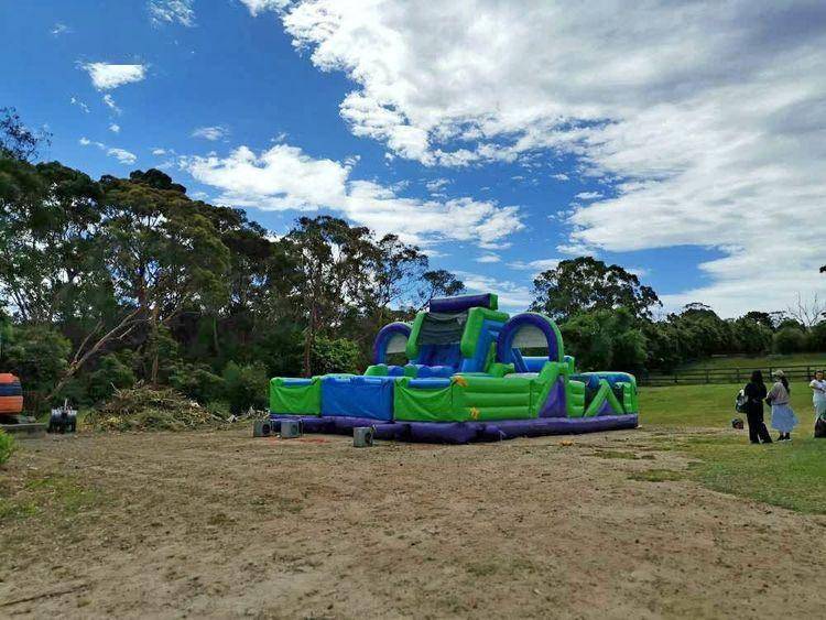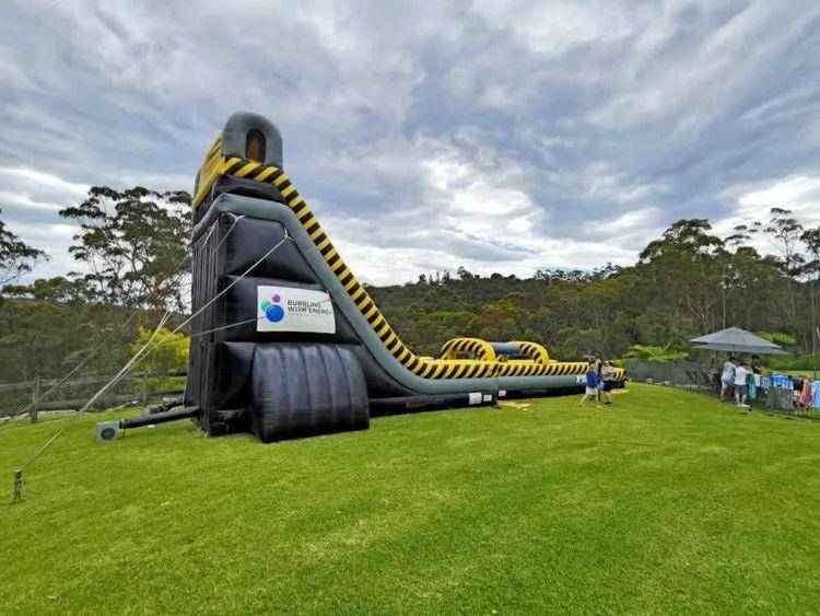 三块草坪上分别安装了大型充气城堡蹦床和滑梯,孩子们仿佛来到了儿童乐园。