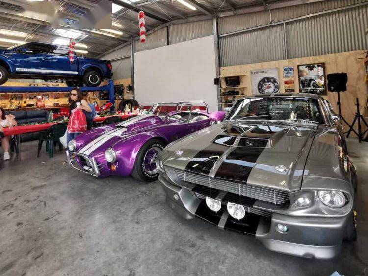 大型餐厅内展示主人收藏的三辆古董老爷车。