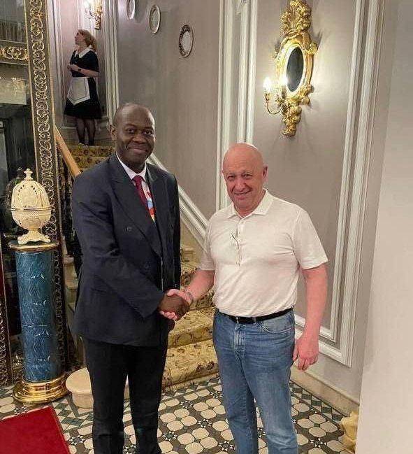 这张照片由与“瓦格纳”关系密切的中非共和国“俄罗斯之家”文化中心负责人德米特里•瑟特伊发布,这名非洲政要是中非总统福斯坦·阿尔尚奇•图瓦德拉的礼宾长弗雷迪•马普卡,配文写道“大使先生与我分享了俄罗斯-非洲峰会的第一张照片,我们看到了一些熟悉的面孔。”