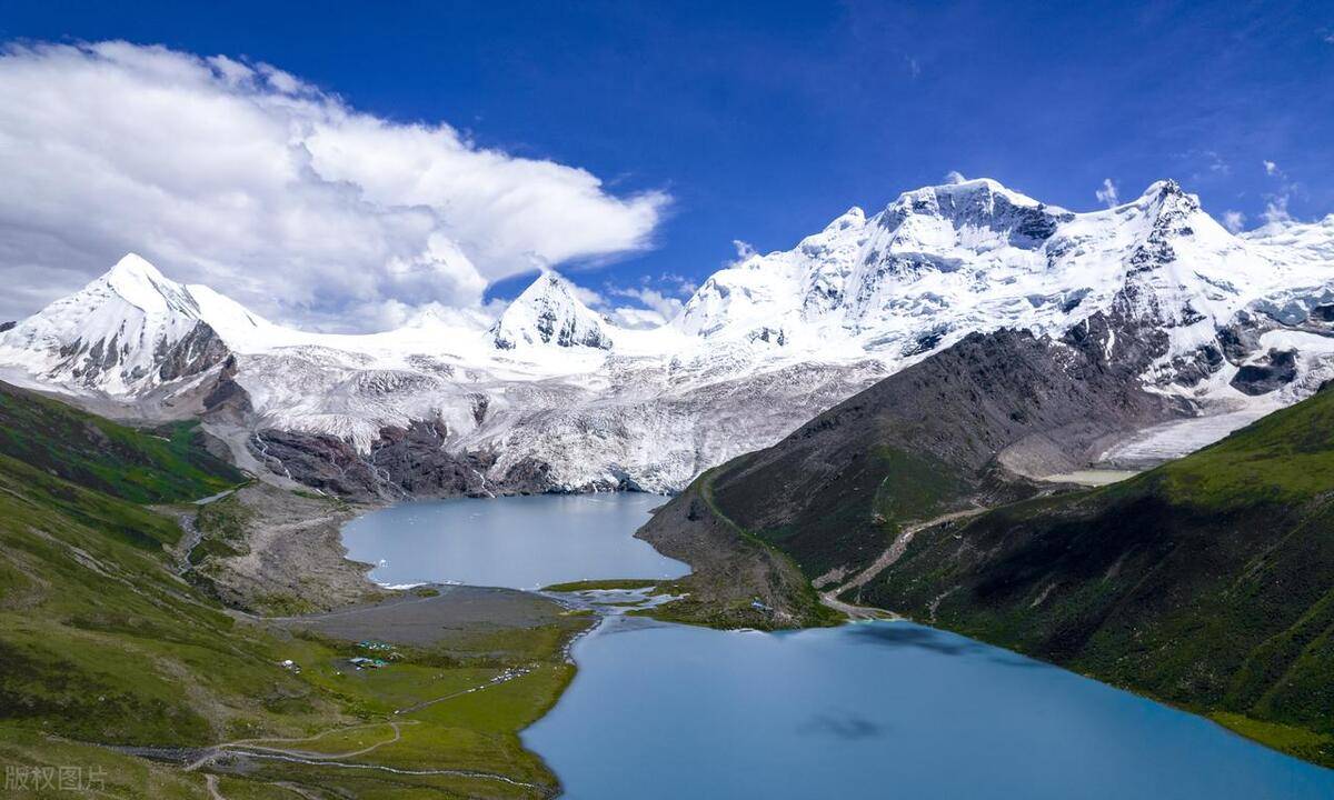 三色湖成不规则“品”字行排列,湖与湖之间由低山平台隔开,在阳光下颜色各异,故称“三色湖”。三色湖旁的祥格拉冰川,又是一幅蓝色冰雪童话世界。