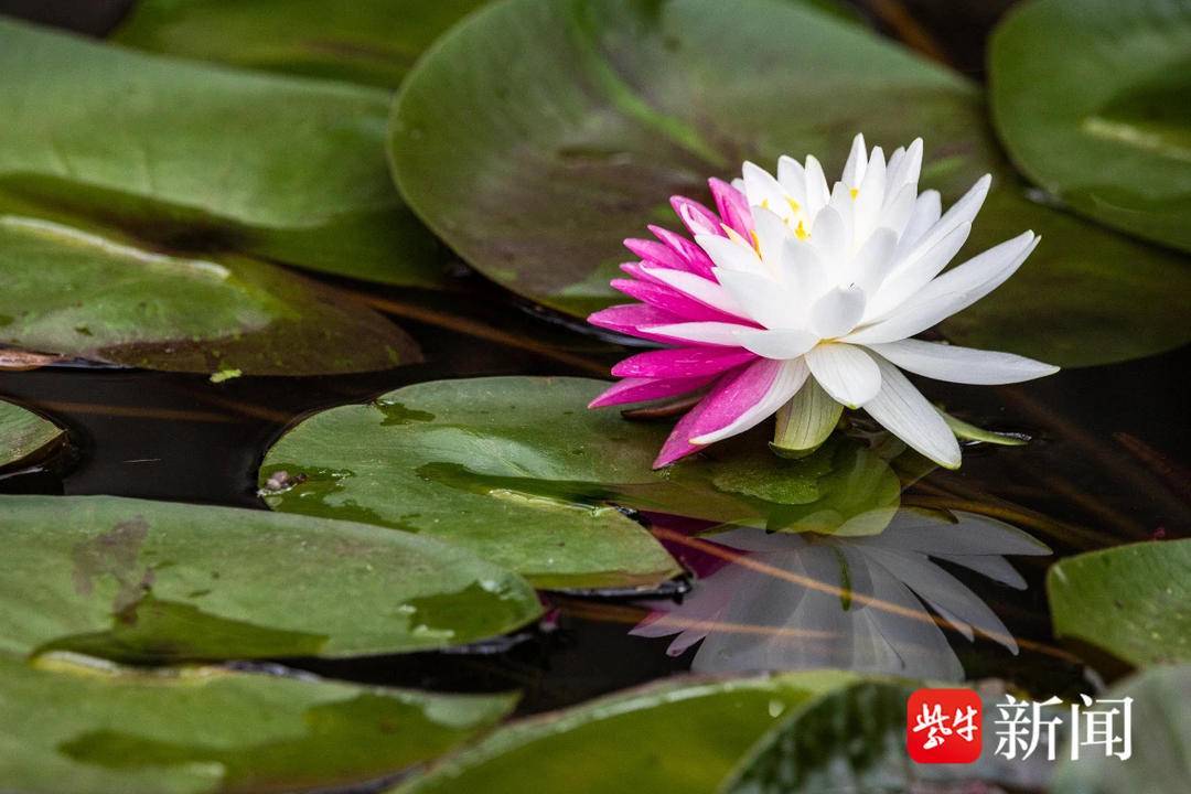 这株睡莲的品种为“夹克丰”,曾获 IWGS(世界睡莲水景园艺协会)最佳睡莲新品种和最佳耐寒睡莲双一等奖。“夹克丰”一花双色的原因并非基因突变,这个品种可以开出白色和红色两种颜色,但多数是红色花瓣上点状分布白色,这种半白半红,泾渭分明的很罕见。