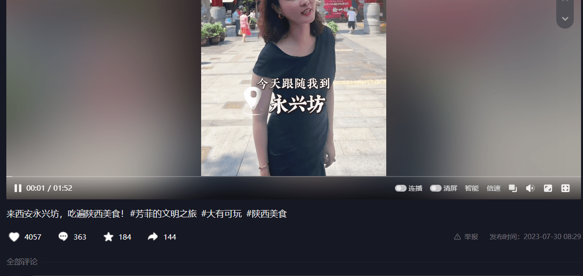与此同时,刘芳菲还发布了一则时长达01:52秒的短视频,该视频系刘芳菲到西安永兴坊游玩的画面,下面就让我们一起跟随刘芳菲的镜头来看看此次陕西之行都有哪些值得关注的亮点之处: