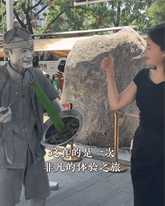 “银人阿少”此次在景区摆出的造型是介绍陕西的宽面,刘芳菲被“银人阿少”碗里的这个道具所吸引,她大赞“银人阿少”的这个面条宽如裤带,而一向以严谨著称的“银人阿少”此次在名人刘芳菲面前也有点招架不住了,特别是当刘芳菲说面宽如裤带之后,他当即连连点头,并大笑起来。说罢,刘芳菲临行之前还特意竖大拇指给“银人阿少”点赞。