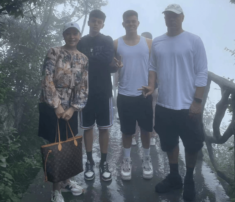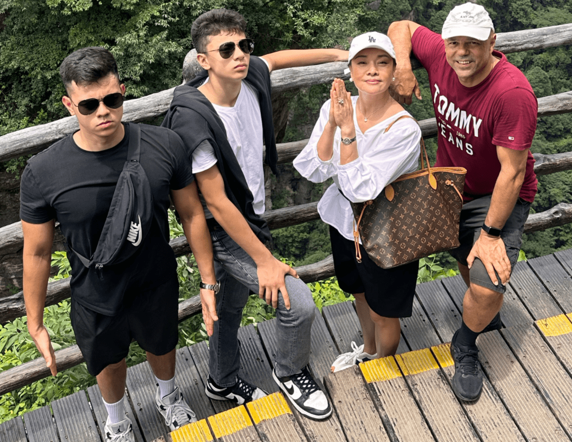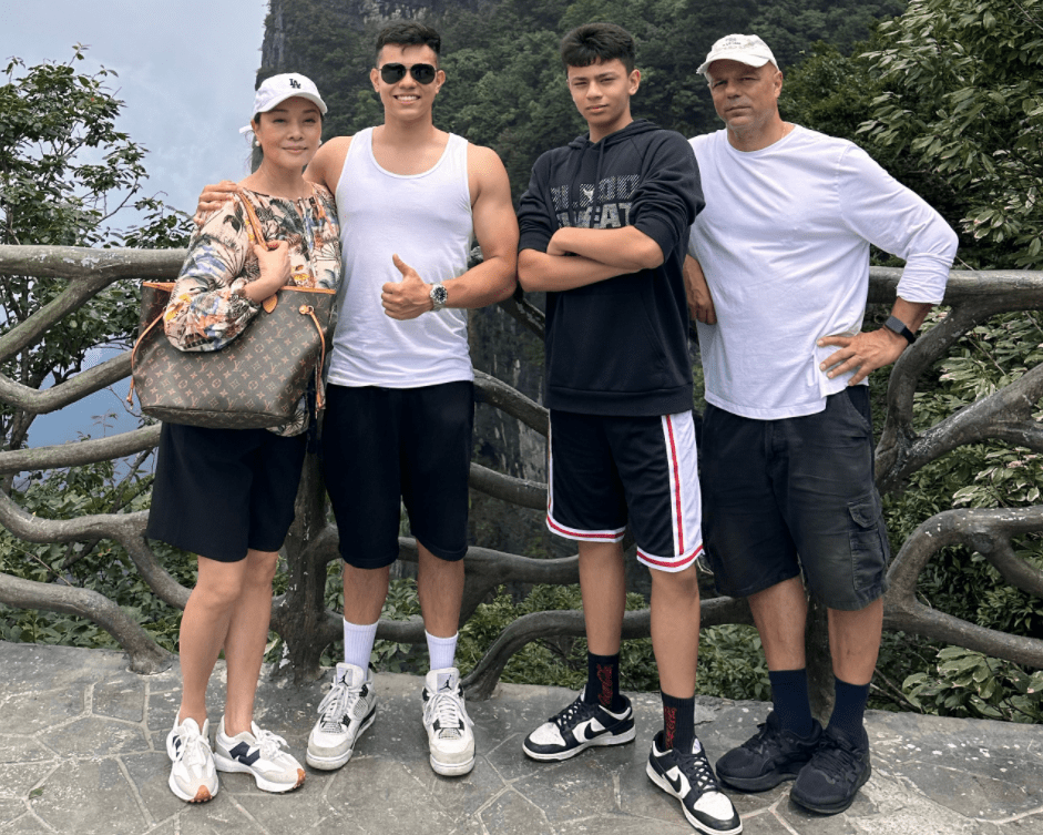 59岁史可晒全家福,全家张家界游玩,俩混血儿子身材健硕很帅气