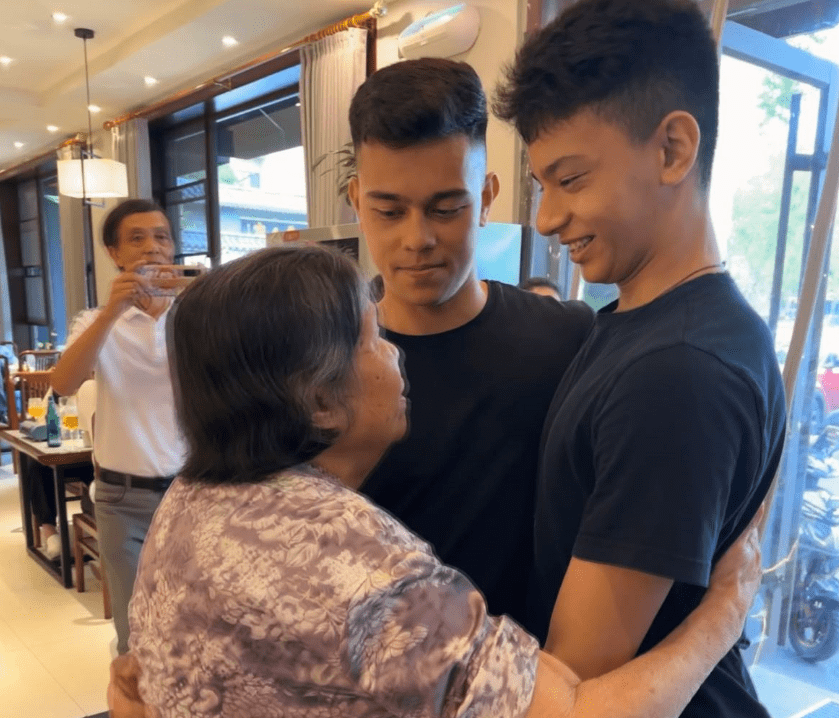 这次全家回国,最主要的原因就是时刻要让两个儿子给外婆庆生,祖孙三人拥抱在一起画面别提多温馨了。