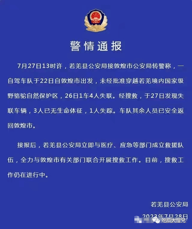 7月28日,新疆若羌县公安局通报,22日一自驾车队自敦煌市出发,未经批准穿越若羌境内保护区。 26日,1车4人失联,27日发现失联车辆,3人无生命体征,1人失踪。