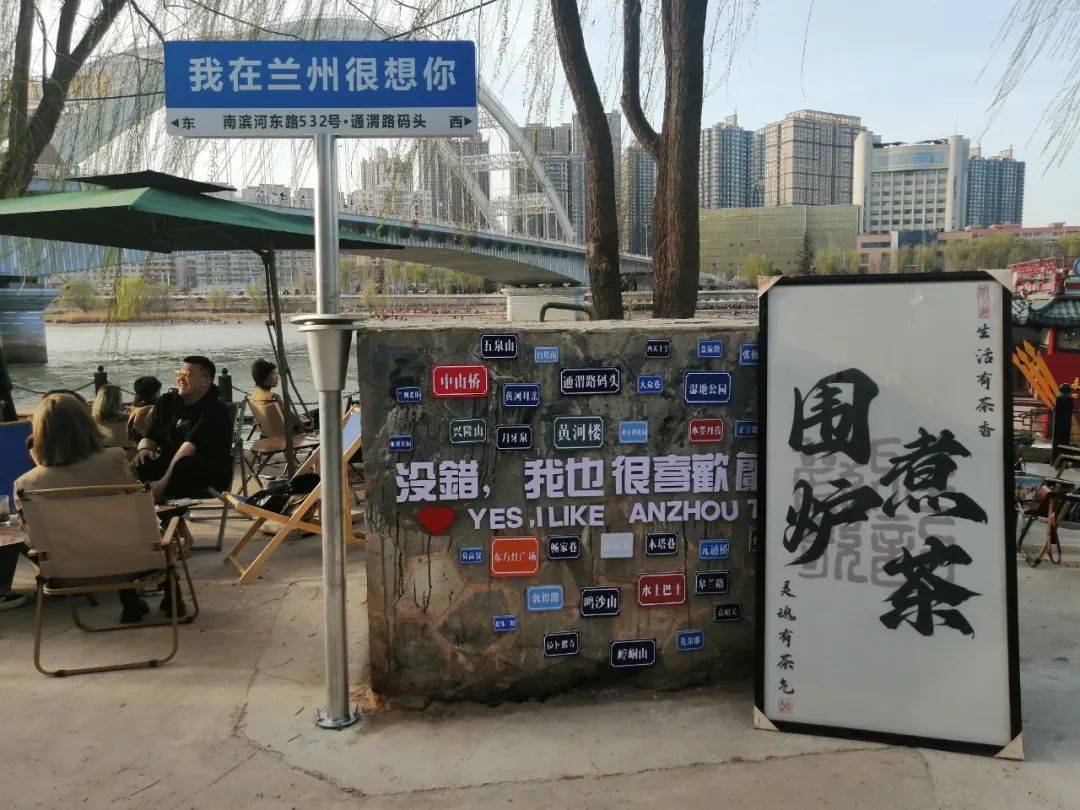元通大桥(通渭路端)下有一家茶摊,新中式标牌上“围炉煮茶”的字样格外显眼,同时配有“没错,我也很喜欢兰州”“我在兰州很想你”等打卡拍照路牌,吸引了市民、游客驻足。一炉炭火,一副烤架,一壶热茶,壶边摆上花生、桂圆、红枣、柑橘等吃食,也有披萨、蛋糕等零食……大学生模样的年轻人围坐着,一边喝茶一边说笑,感受着三月的春光与活力。