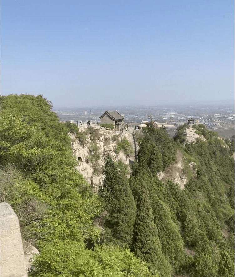 云门山位于青州市区南约2.5公里,是泰沂山脉往北延伸的尽北端,海拔421米,呈东西走向,山峰平原拔地而起,山坡绿荫茂密覆盖。山虽不高而有千仞之势,自古为鲁中名山,登山之路为青石台阶,穿越山林,曲径通幽,婉蜒曲折,直达山顶。此刻,游人如织,沿着曲折盘绕并不太宽的石阶小路奋力攀登,观看景色之际,既锻炼了身体,又增长见识,平添一份快乐情趣。